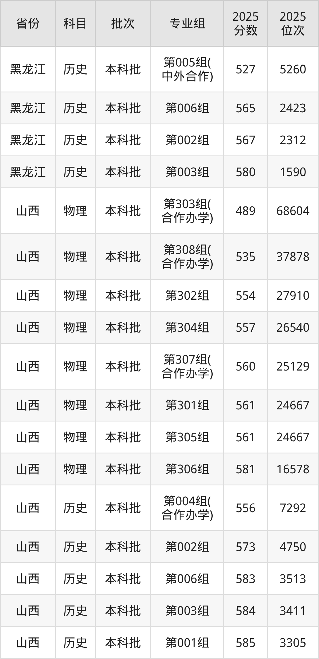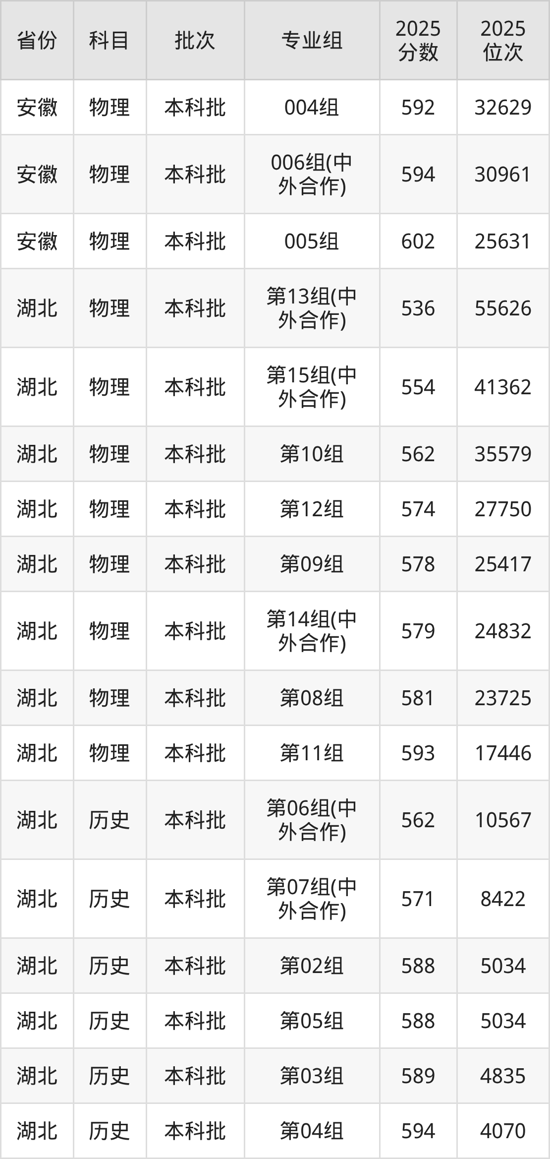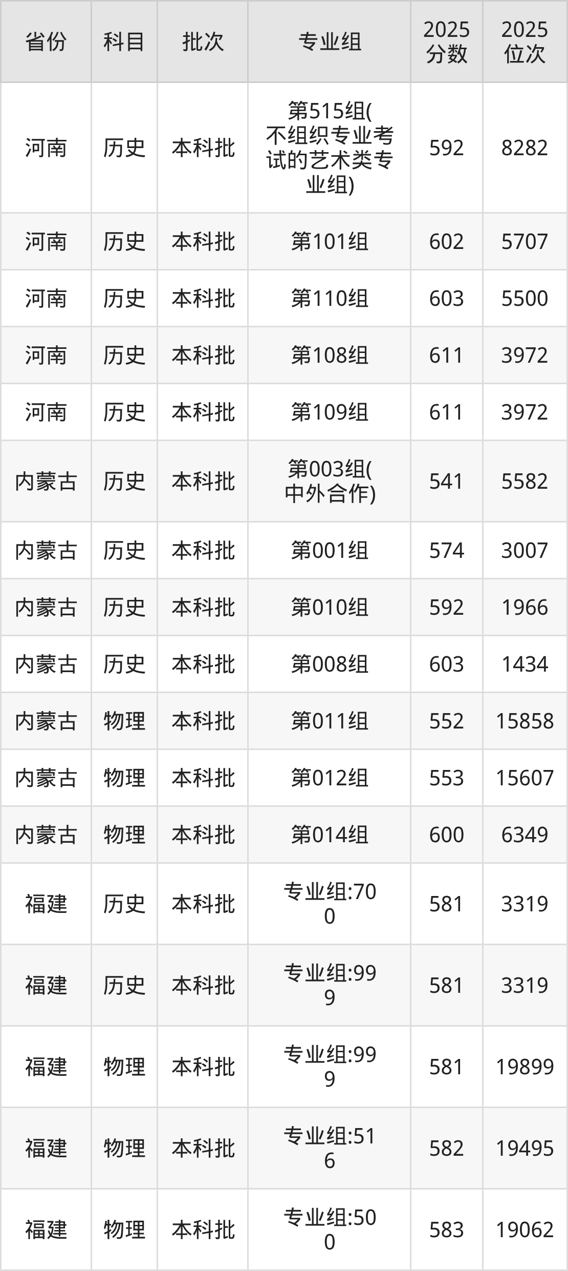 普通类本科物理类最低542分,本科历史类最低566分