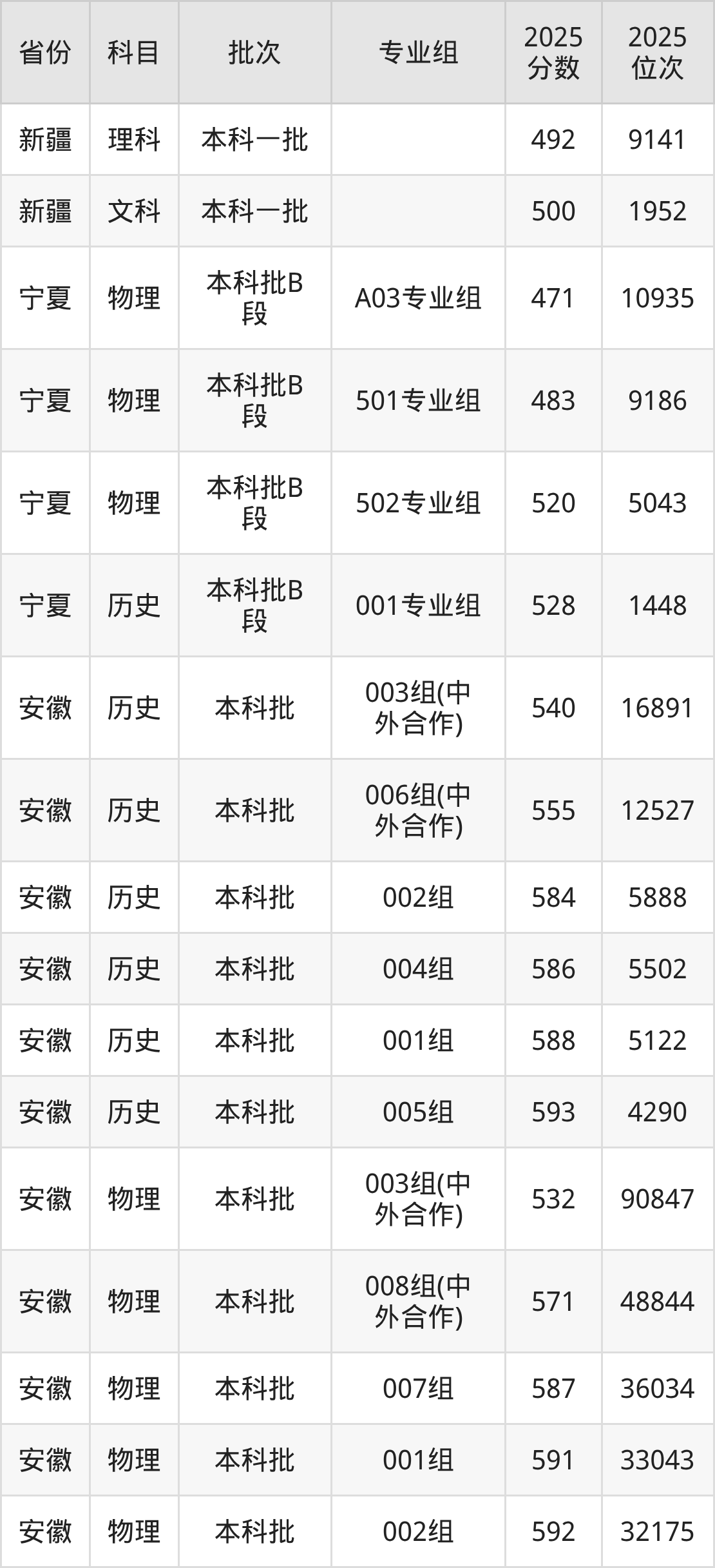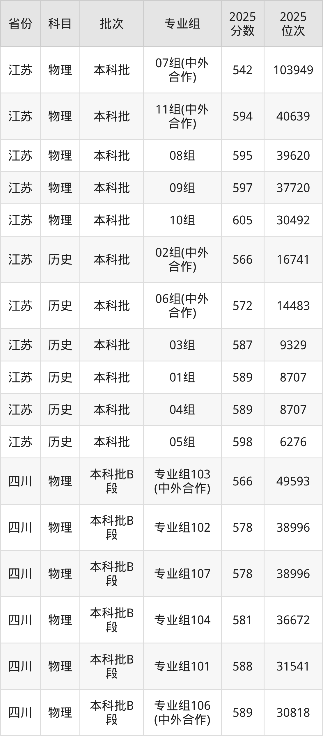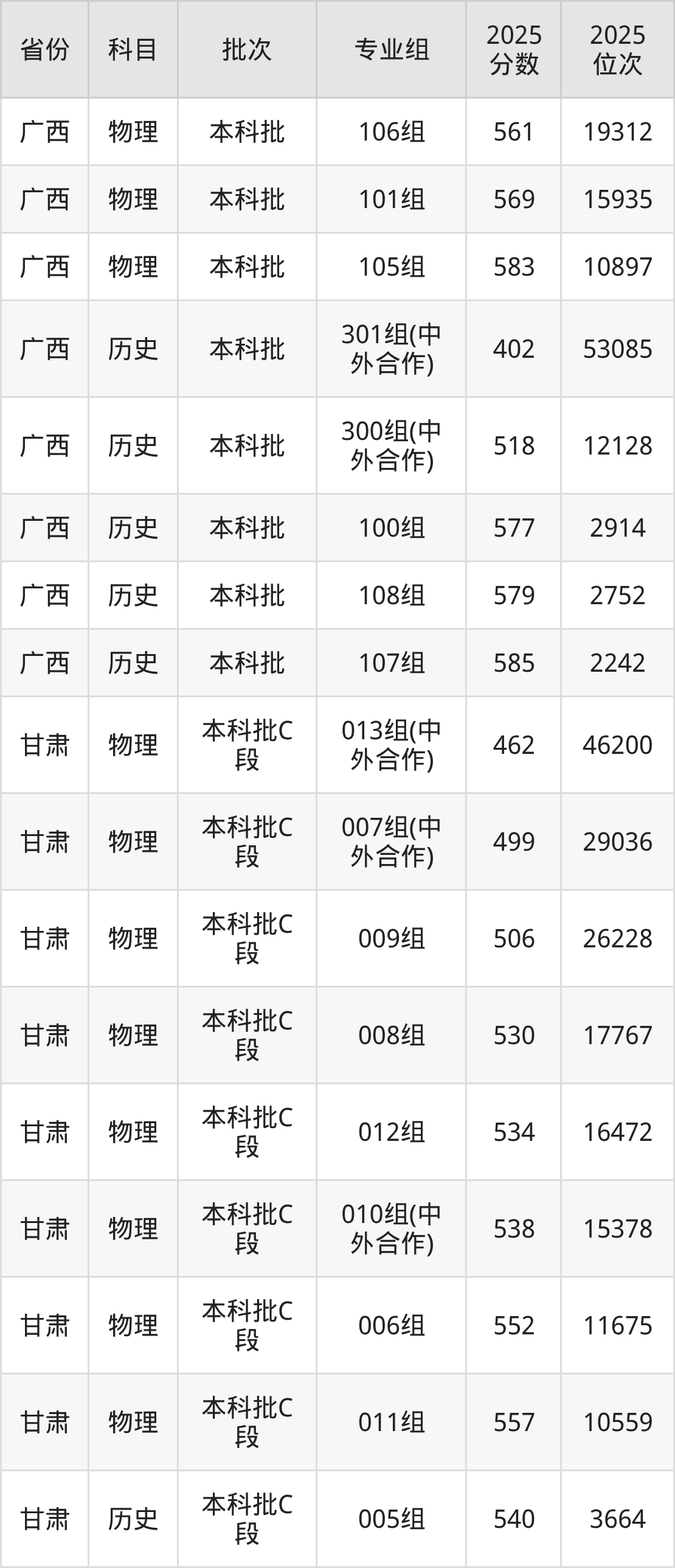 普通类本科物理类最低542分,本科历史类最低566分