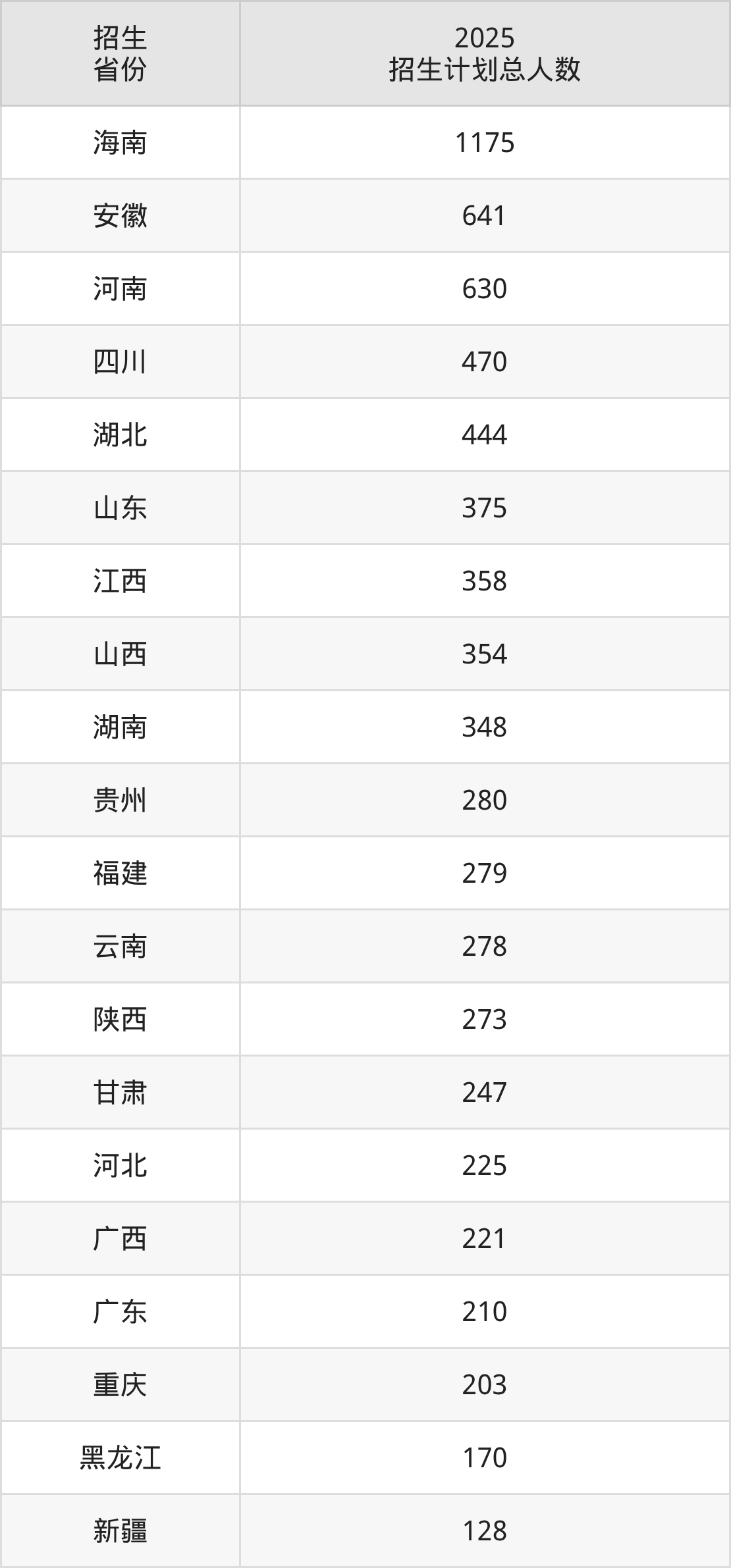 2025年海南大学面向全国29个省市开展本科招生;招生专业共73个,招生人数共7793人。2025年在海南省招生计划总人数是1175人,其中,海南大学在海南省招生人数最多的是乡村治理。海南大学在各省具体招生人数情况如下表。