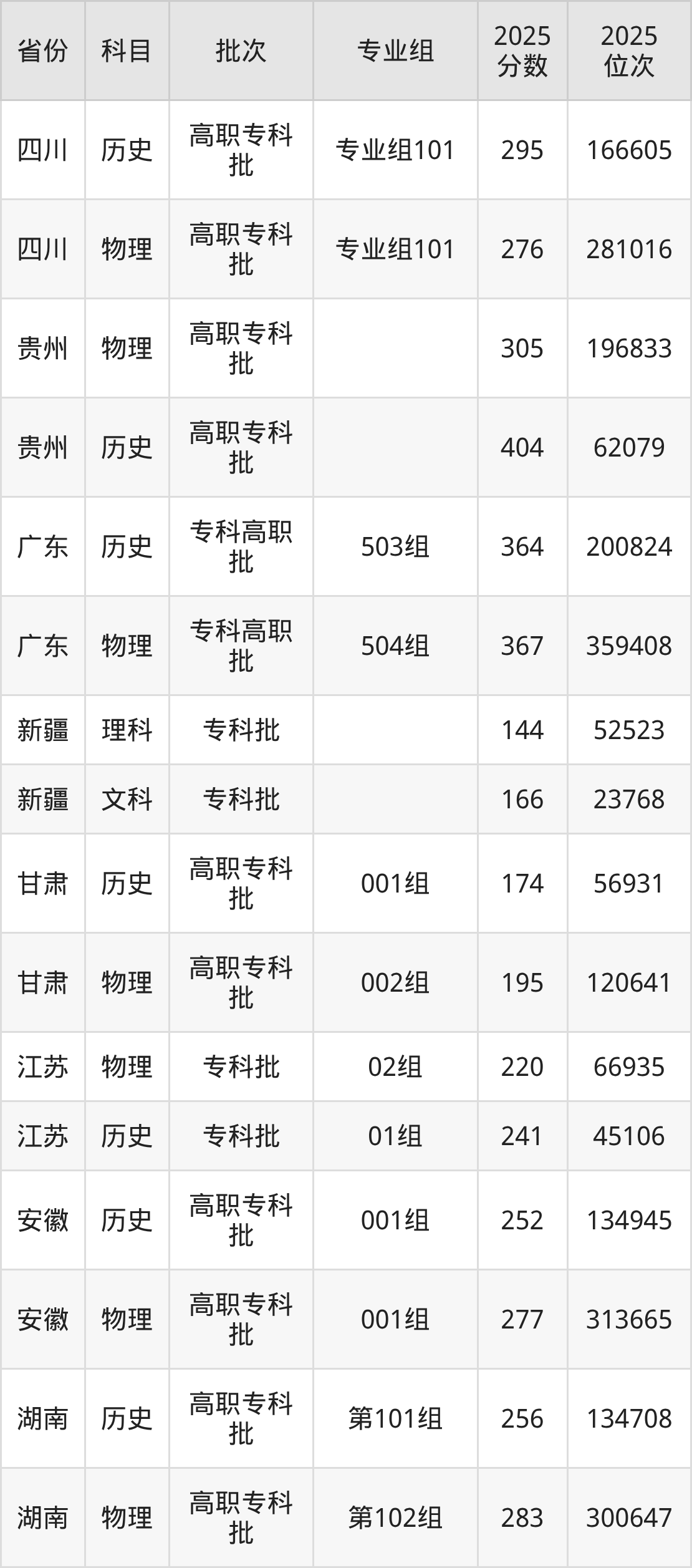 西安高新科技职业学院专业组101:2025年投档录取最低分为295分,录取最低位次为166605名。