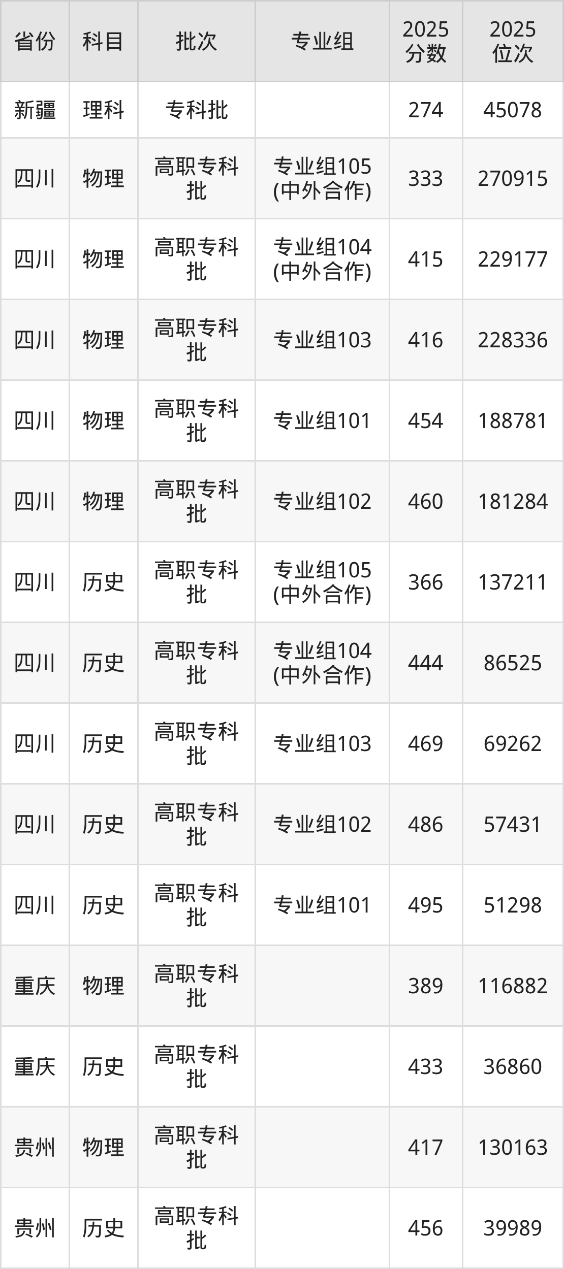 下面是2025年成都职业技术学院全国录取分数线一览表,请查阅。