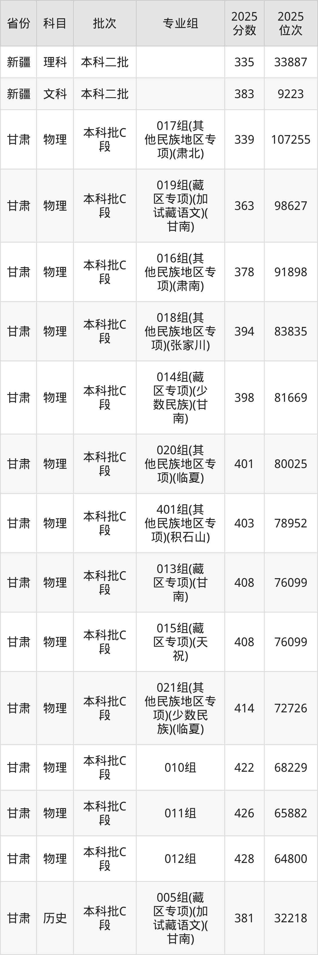 陇南师范学院017专业组(其他民族地区专项)(肃北):2025年投档录取最低分为339分,录取最低位次为107255名。
