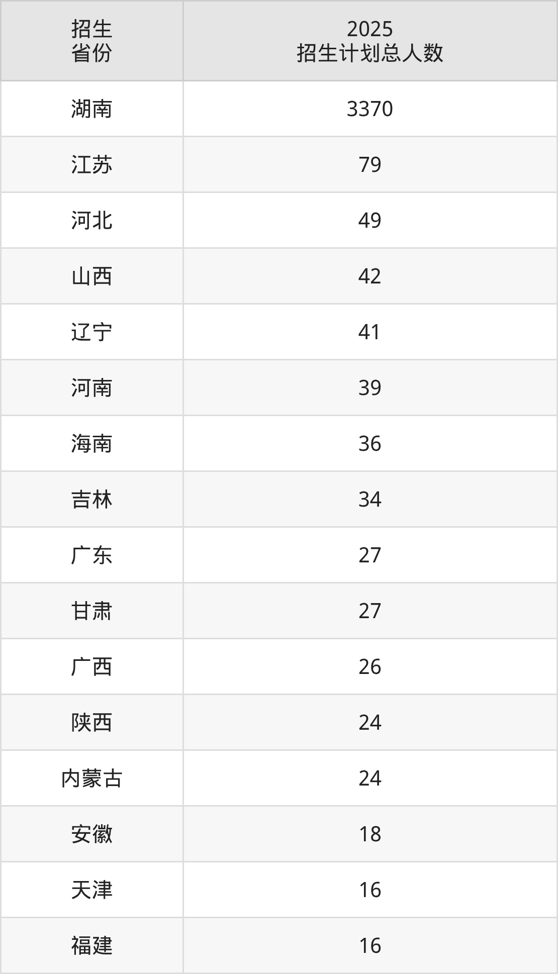 2025年湖南科技学院面向全国25个省市开展本科招生;招生专业共42个,招生人数共3959人。2025年在湖南省招生计划总人数是3370人,其中,湖南科技学院在湖南省招生人数最多的是电气工程及其自动化。湖南科技学院在各省具体招生人数情况如下表。