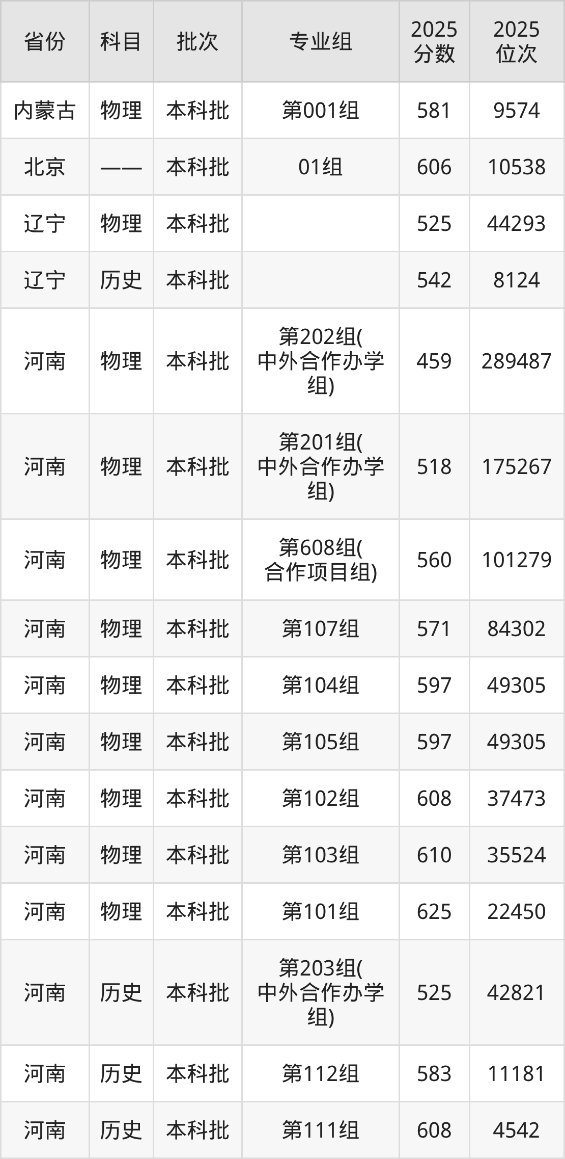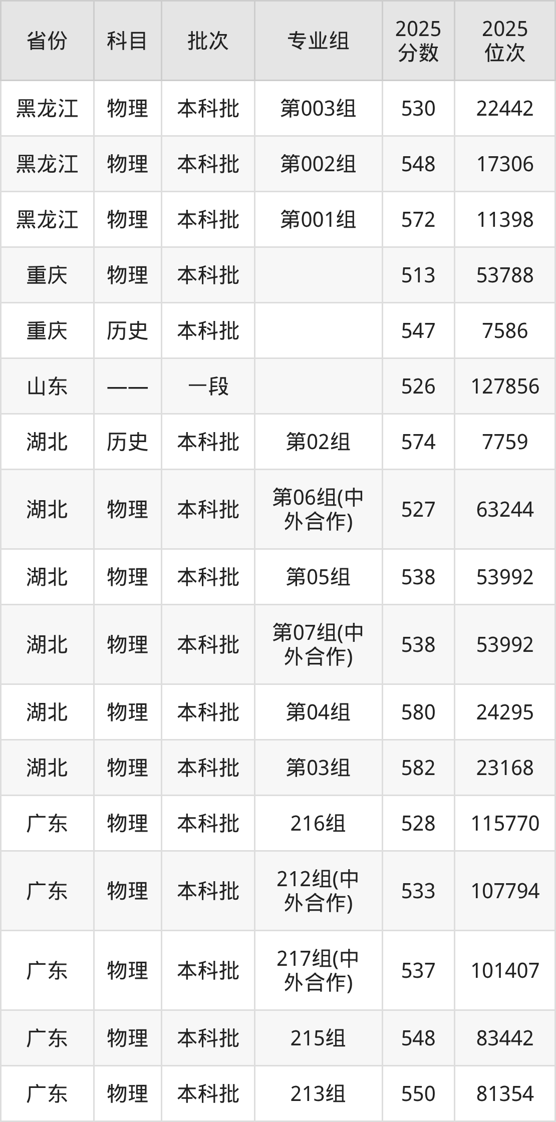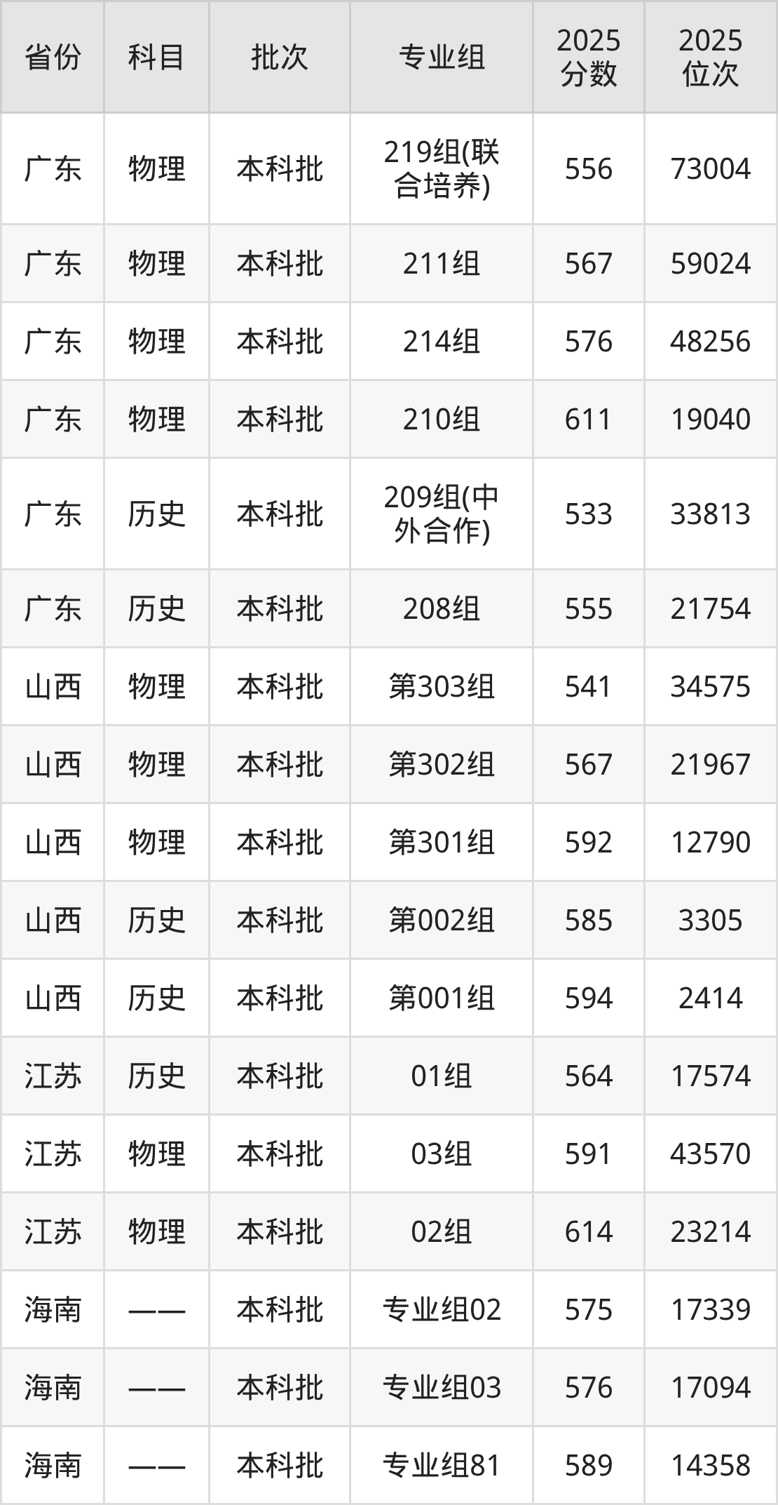 2025年在本科物理类进行招生,各专业组分数线详情如下: