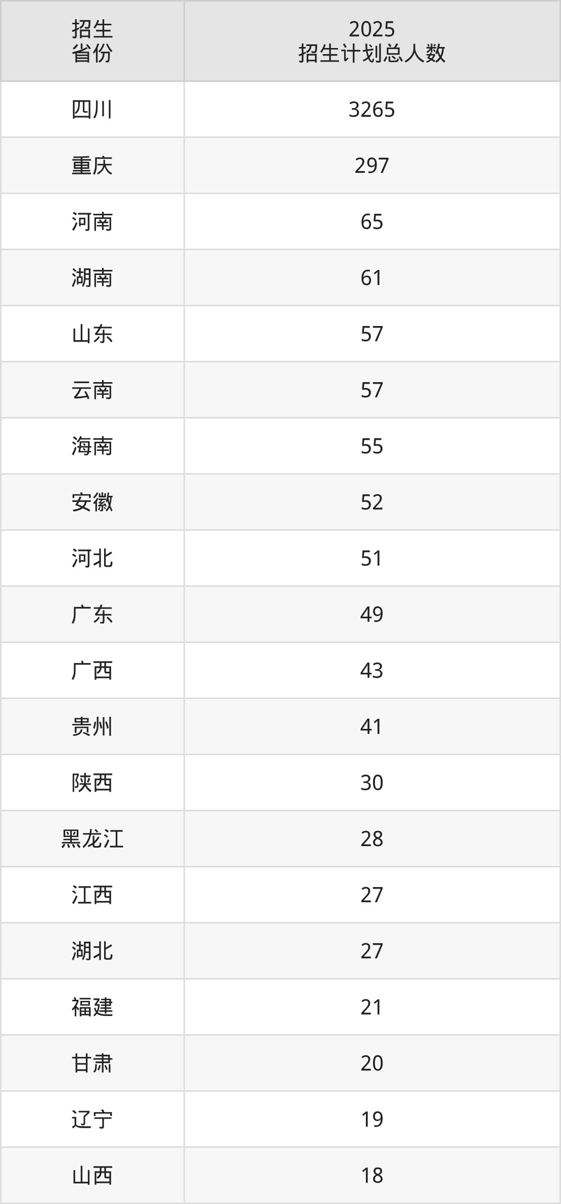 2025年成都中医药大学面向全国29个省市开展本科招生;招生专业共32个,招生人数共4371人。2025年在四川省招生计划总人数是3265人,其中,成都中医药大学在四川省招生人数最多的是护理学。成都中医药大学在各省具体招生人数情况如下表。