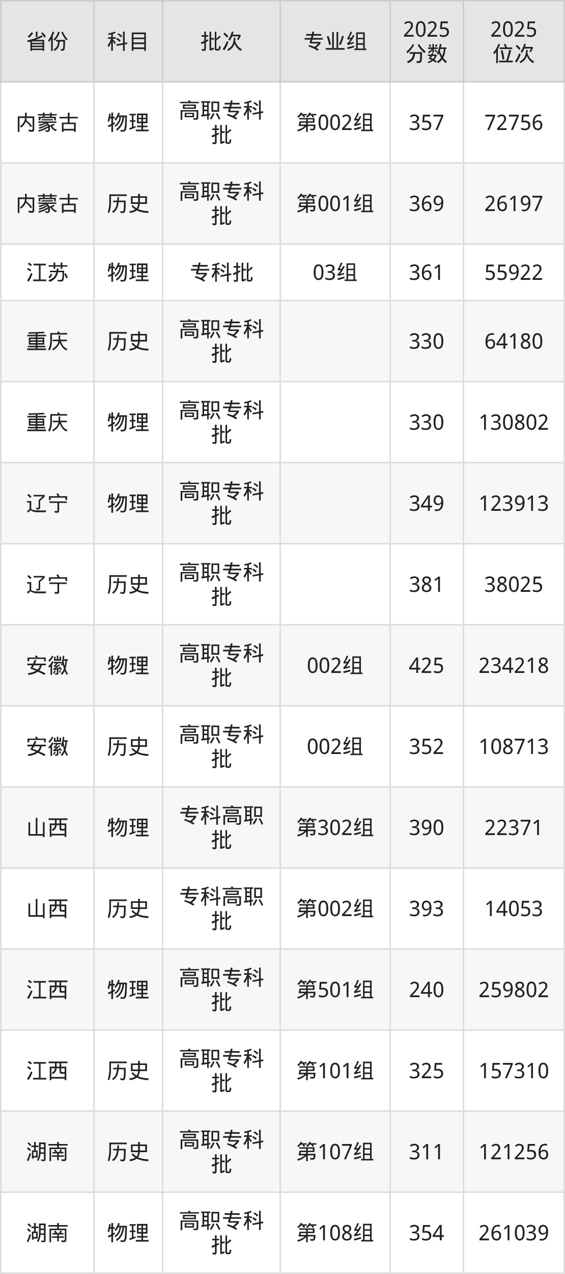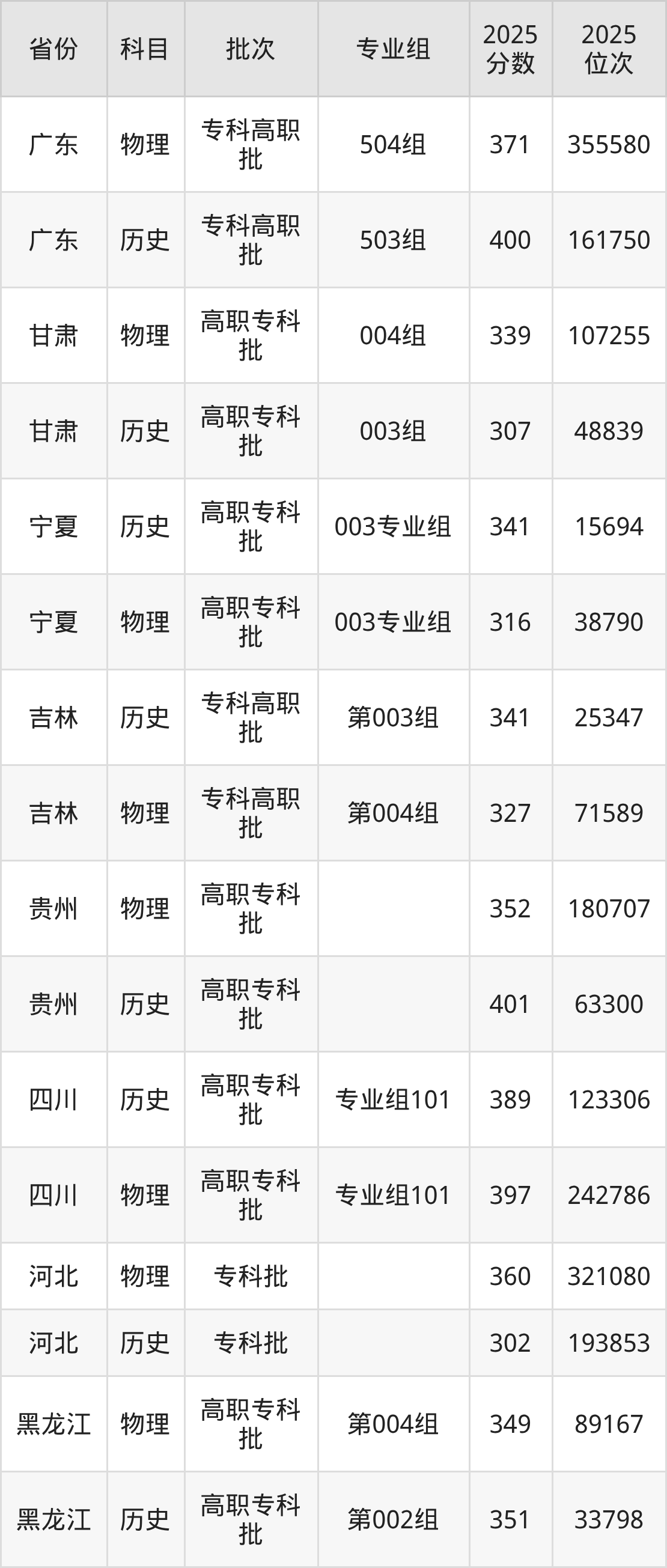 2025年在专科物理类进行招生,各专业组分数线详情如下: