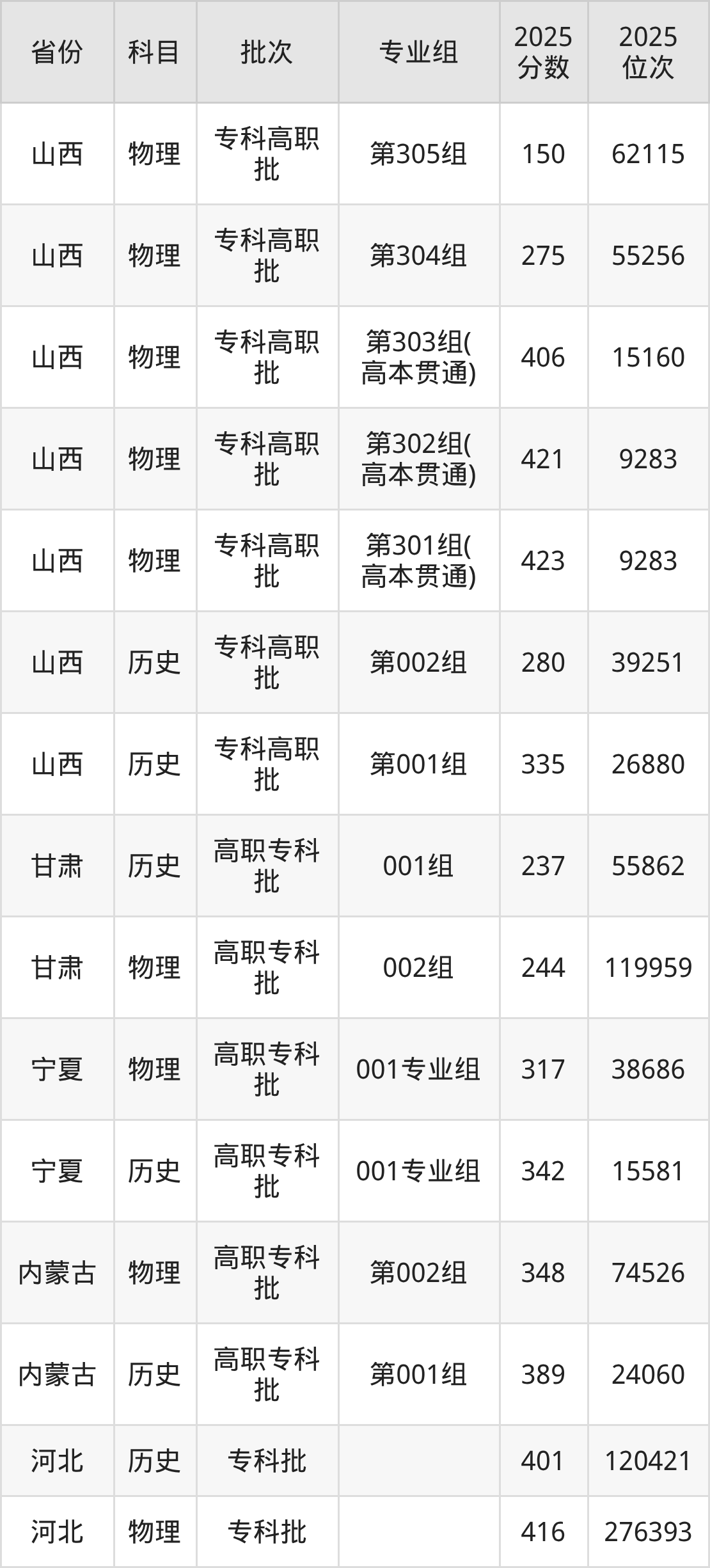 山西水利职业技术学院第301组(高本贯通):2025年投档录取最低分为423分,录取最低位次为9283名。