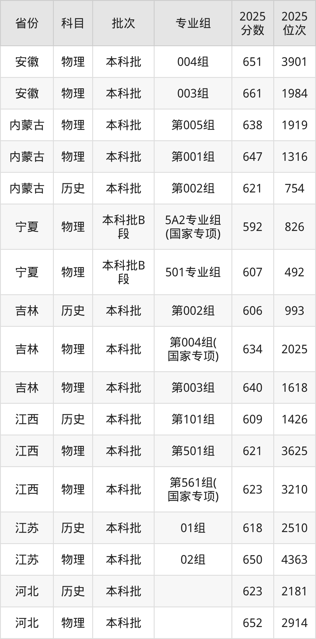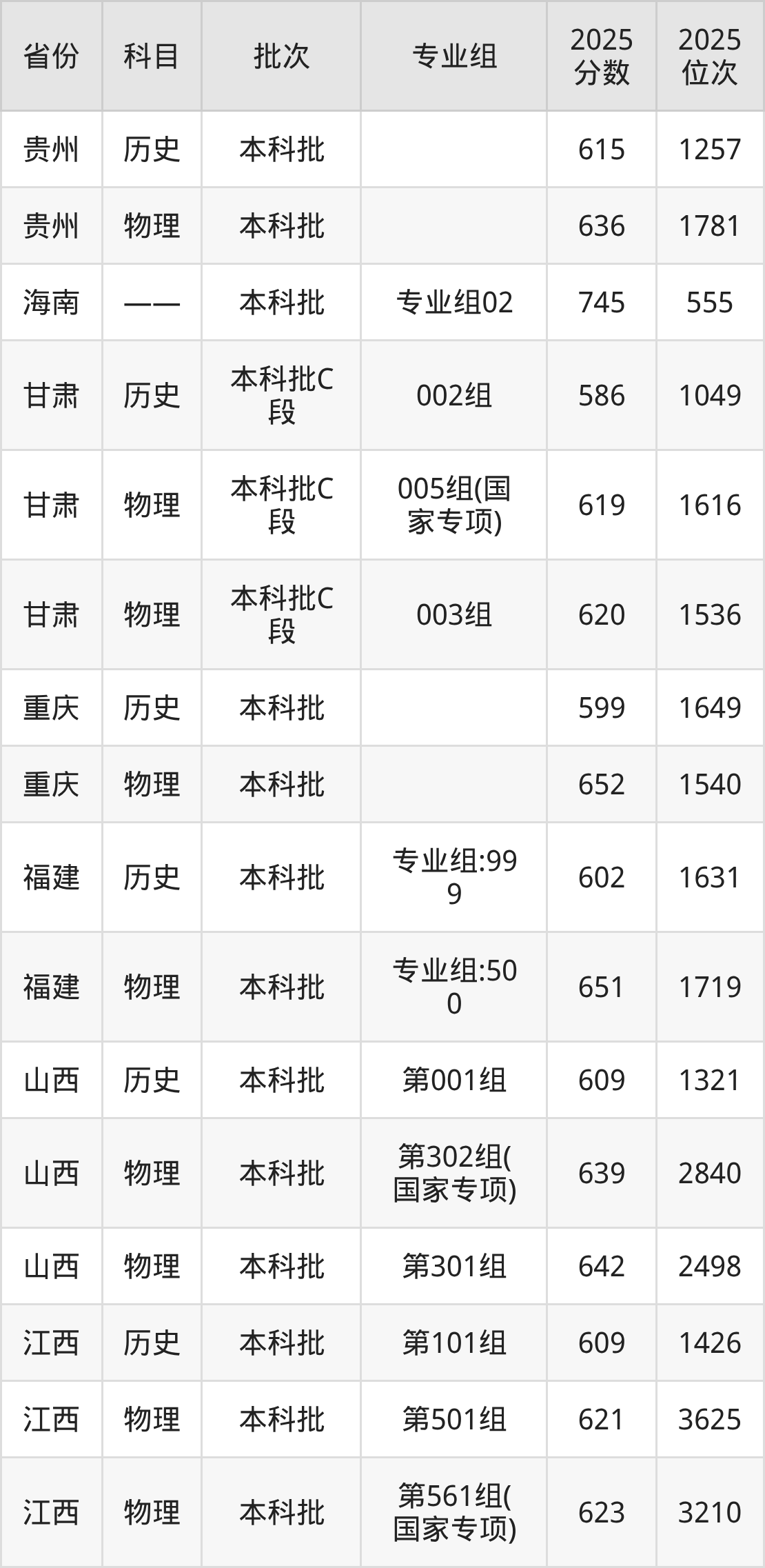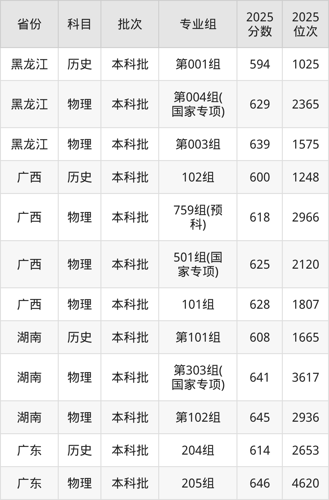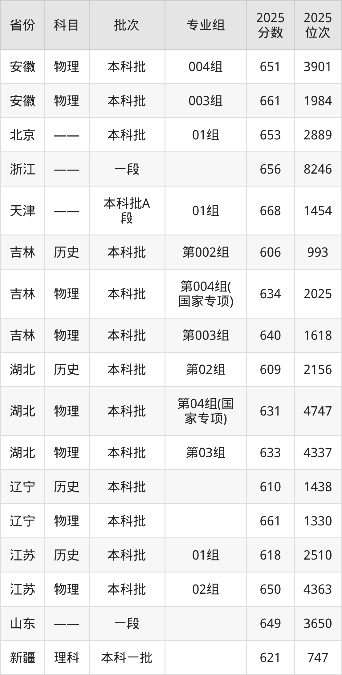 2025年在本科物理类进行招生,各专业组分数线详情如下: