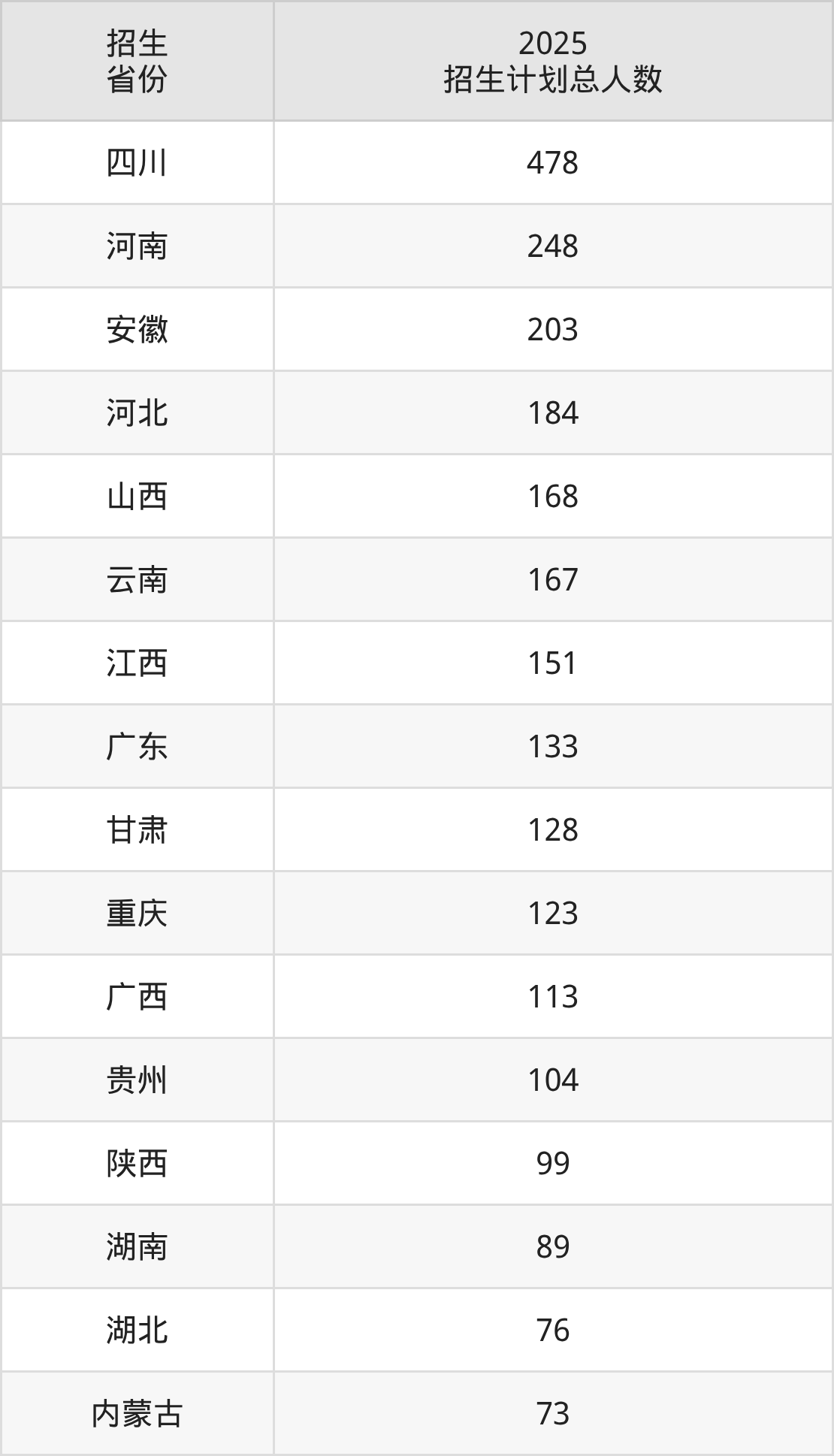 2025年电子科技大学面向全国28个省市开展本科招生;招生专业共24个,招生人数共2983人。2025年在四川省招生计划总人数是478人,其中,电子科技大学在四川省招生人数最多的是电子信息类。电子科技大学在各省具体招生人数情况如下表。
