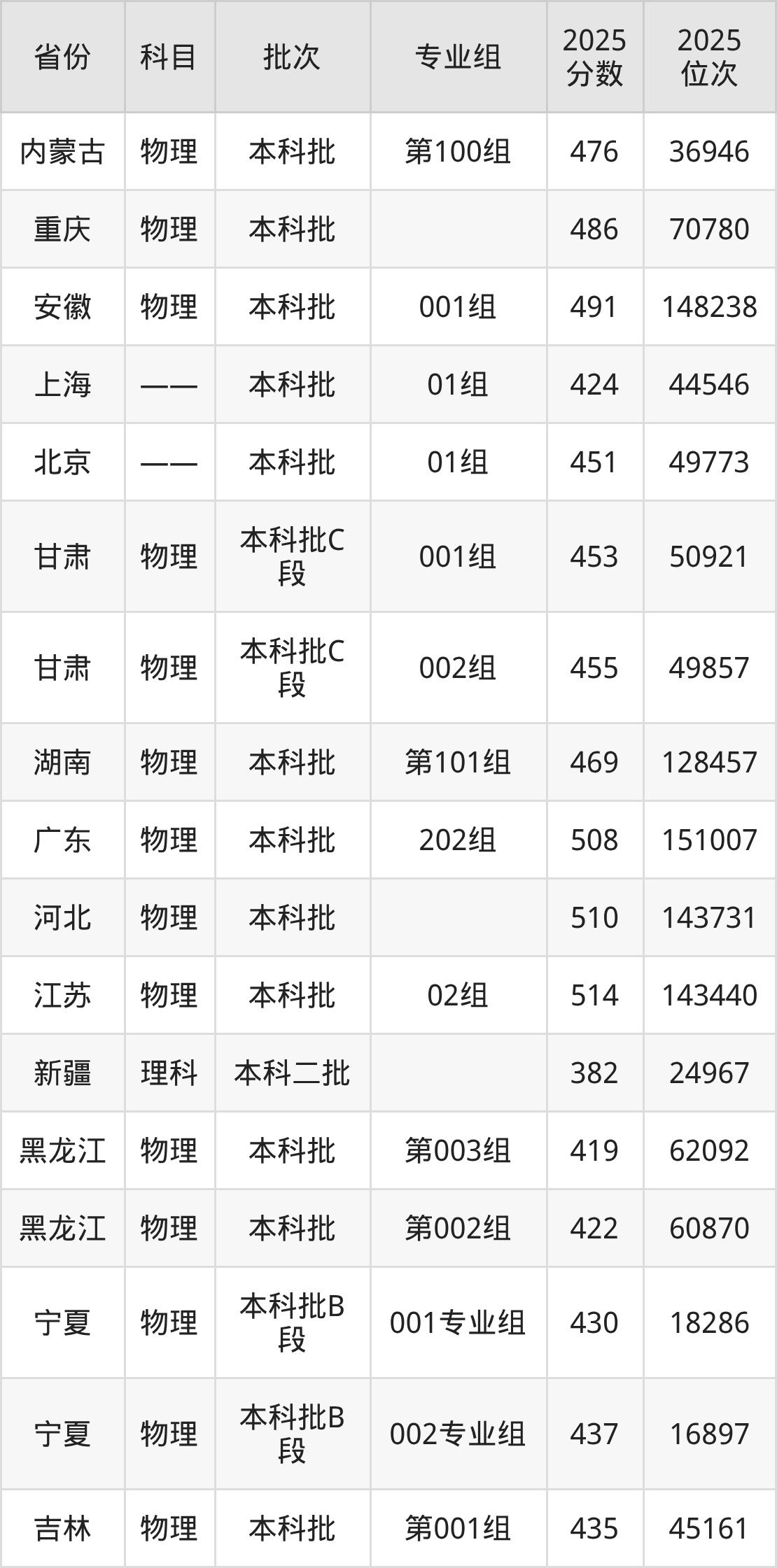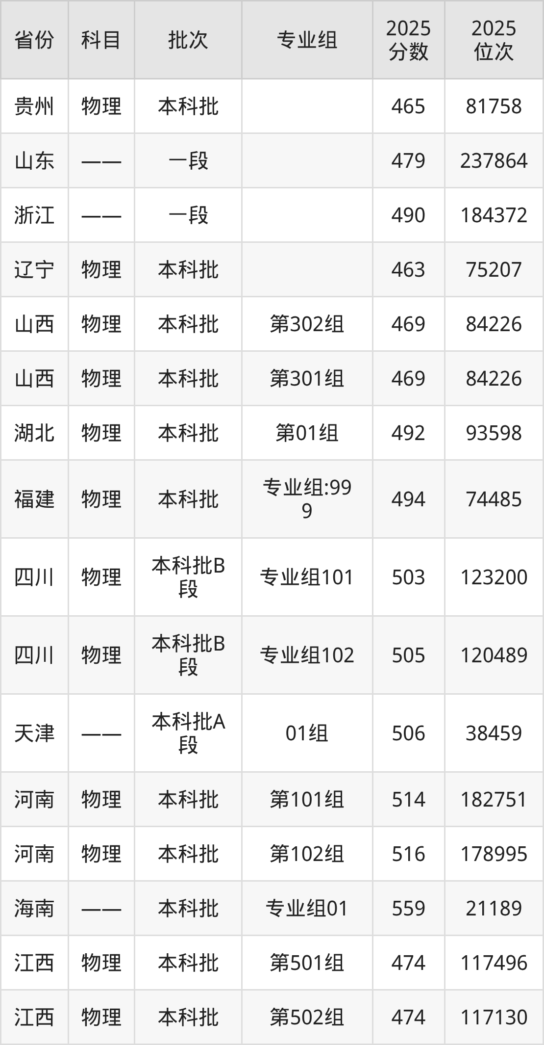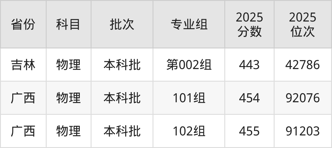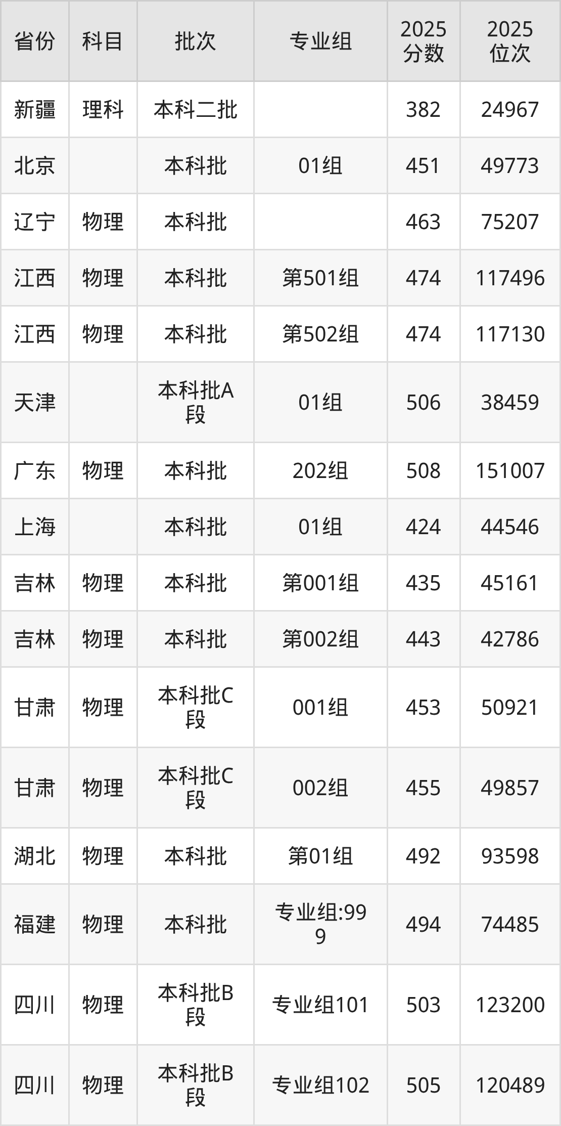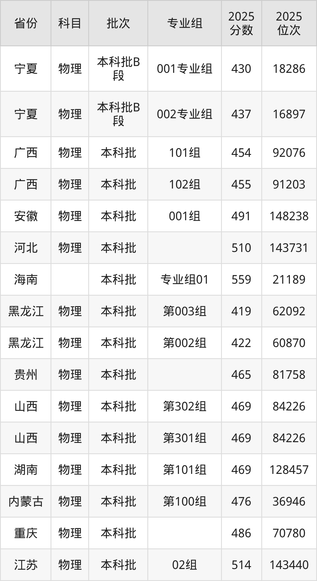 2025年在本科物理类进行招生,各专业组分数线详情如下:
