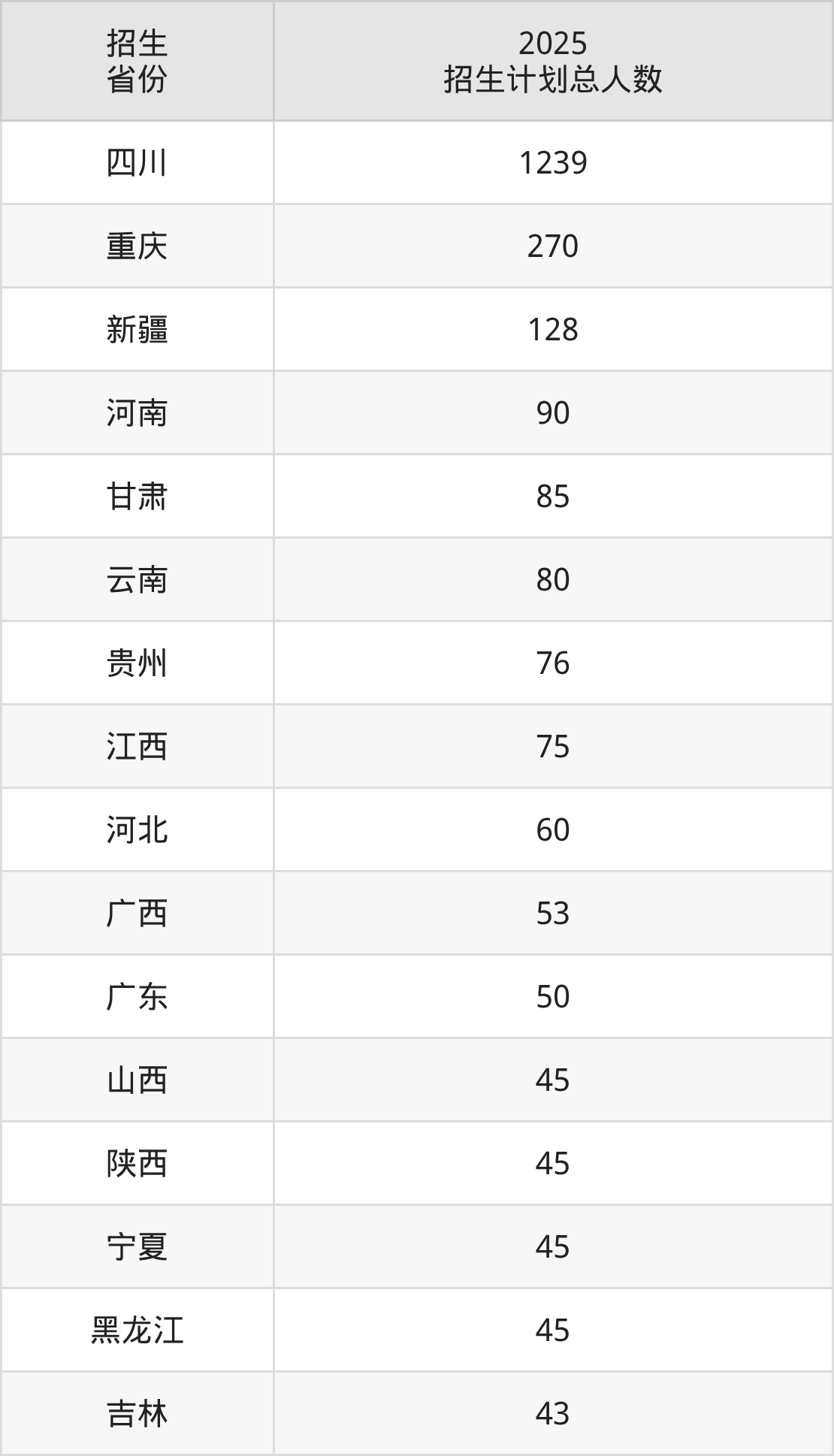 2025年四川工程职业技术大学面向全国28个省市开展本科招生;招生专业共8个,招生人数共1247人。2025年在四川省招生计划总人数是1239人,其中,四川工程职业技术大学在四川省招生人数最多的是数控技术。四川工程职业技术大学在各省具体招生人数情况如下表。