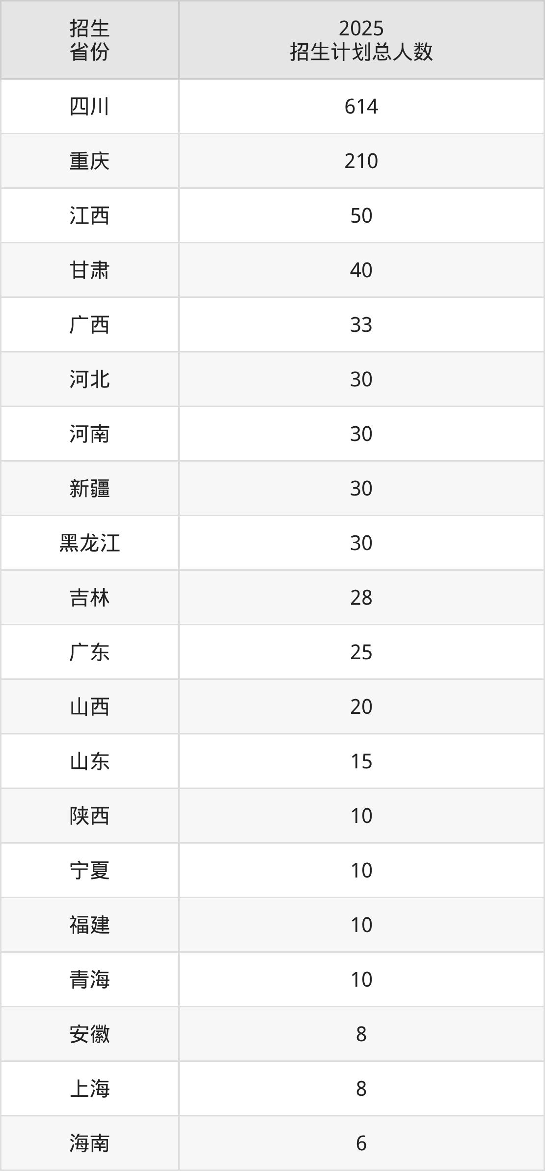 2025年四川工程职业技术大学面向全国29个省市开展本科招生;招生专业共8个,招生人数共1262人。2025年在四川省招生计划总人数是614人,其中,四川工程职业技术大学在四川省招生人数最多的是数控技术。四川工程职业技术大学在各省具体招生人数情况如下表。