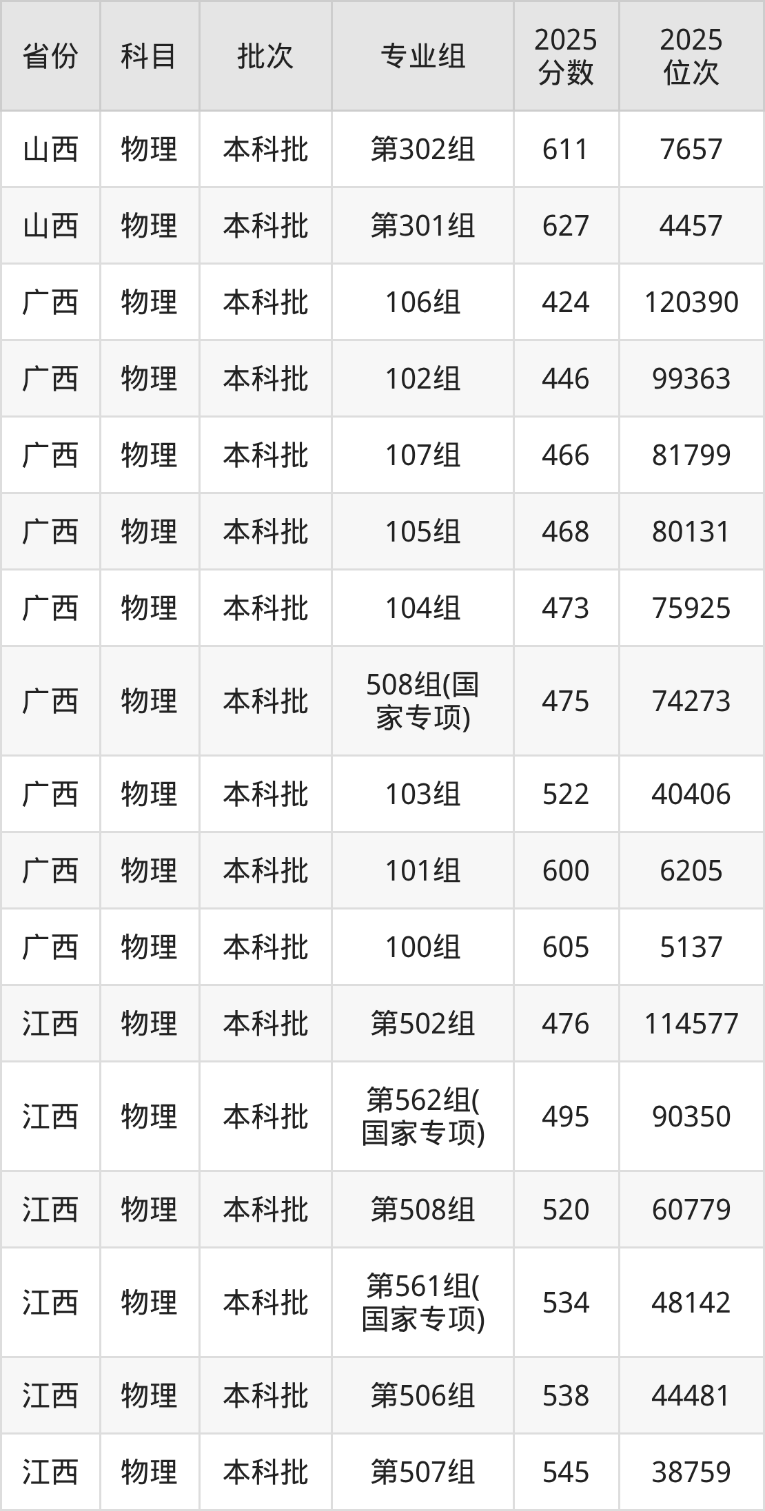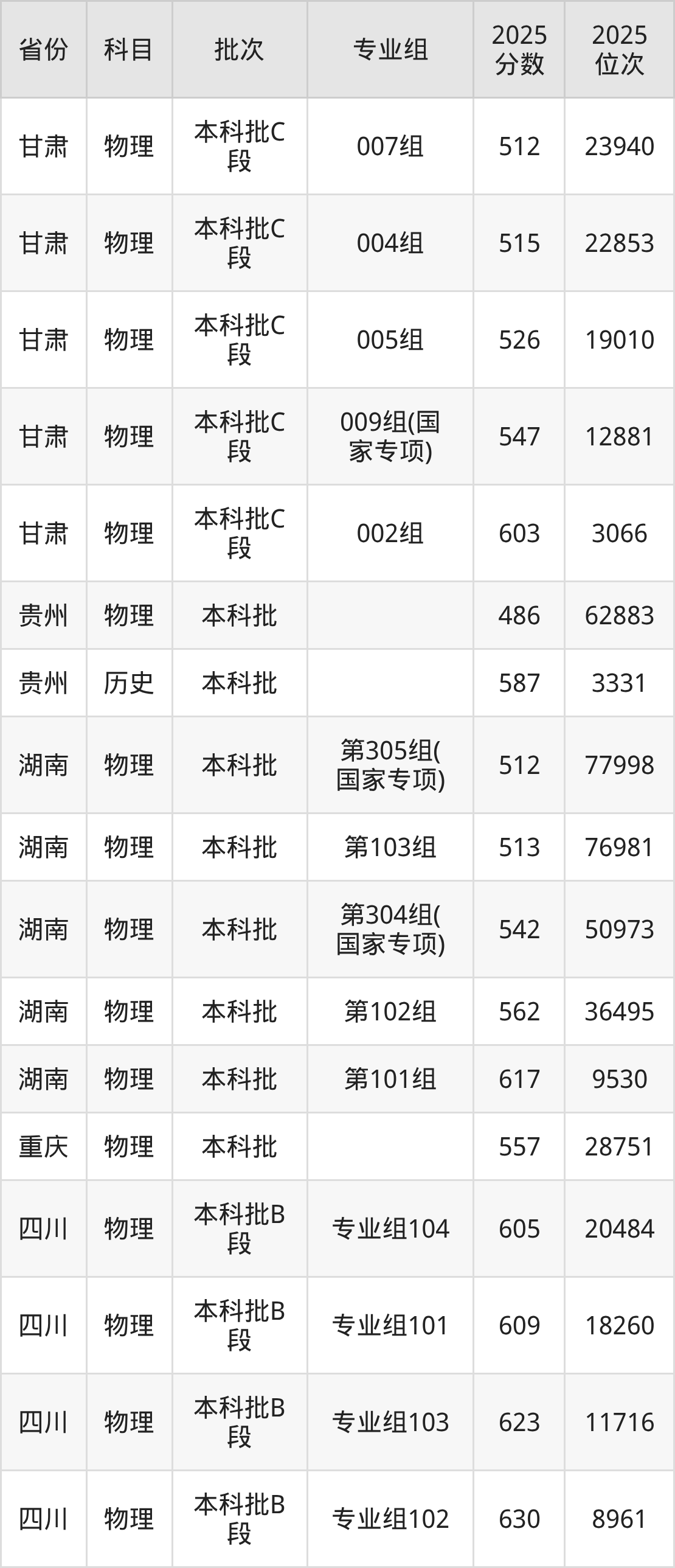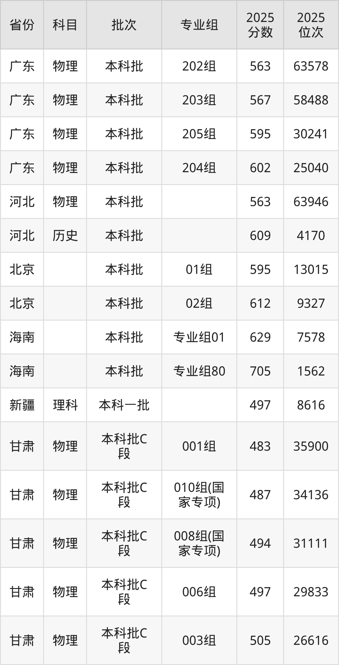 2025年在本科物理类进行招生,各专业组分数线详情如下: