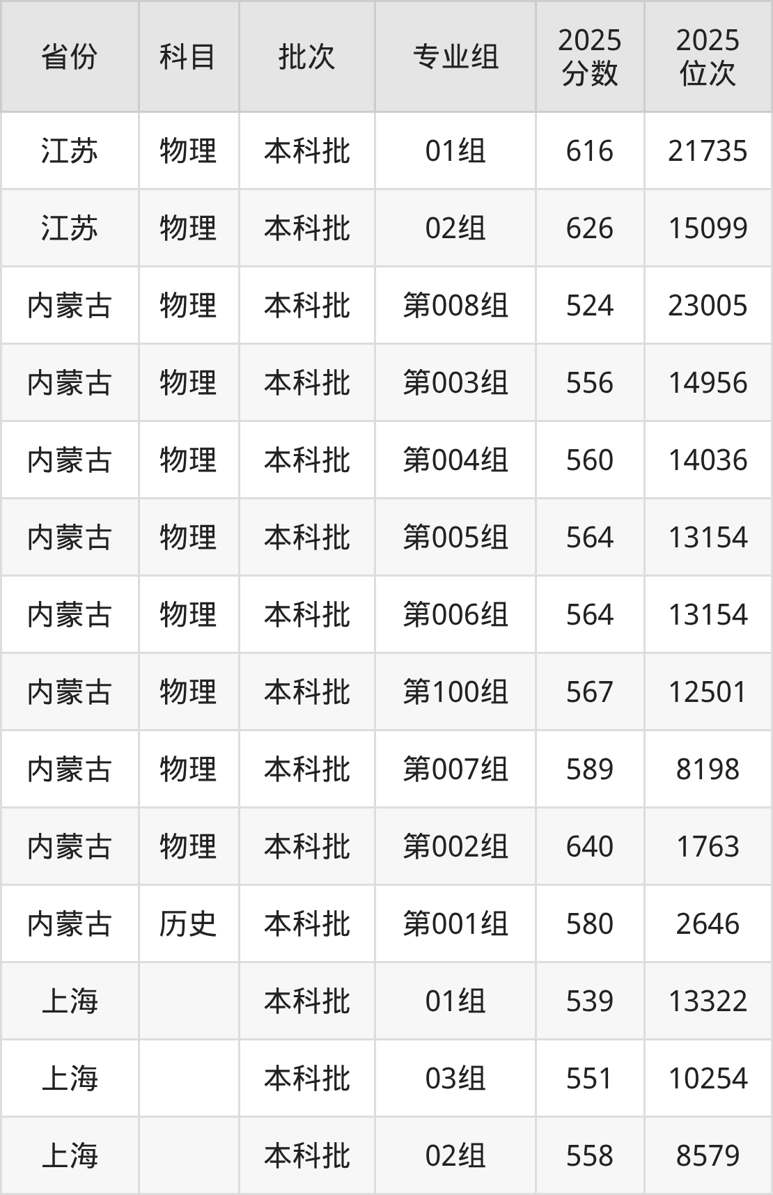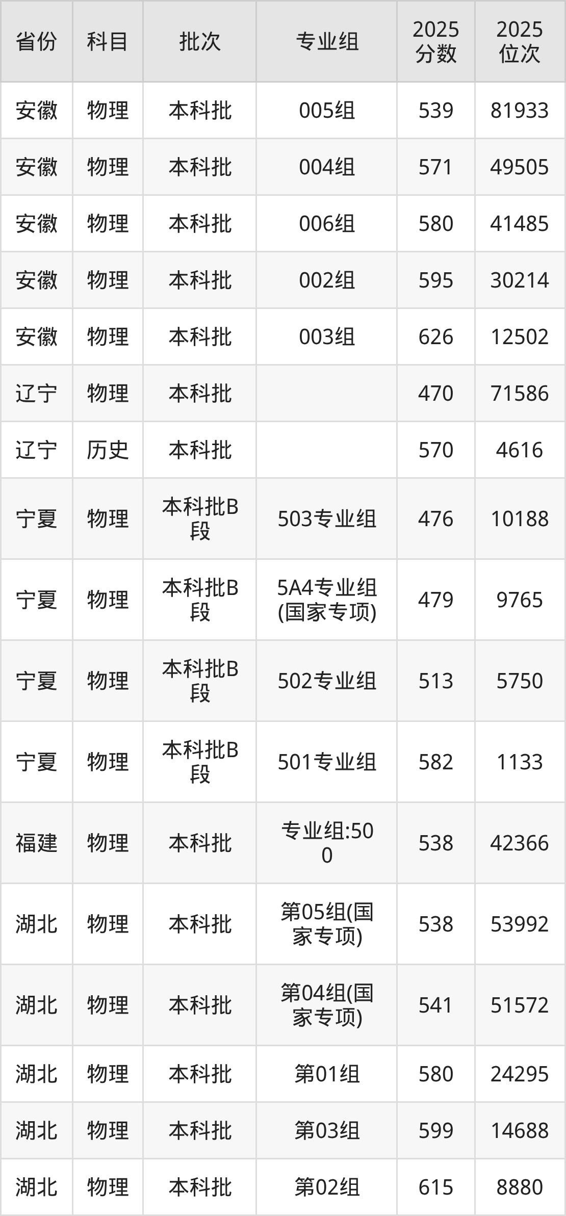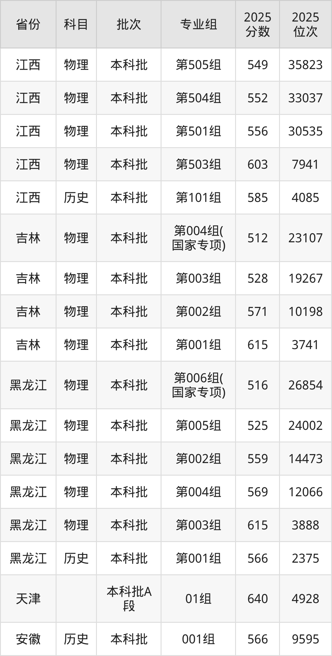 2025年在本科物理类进行招生,各专业组分数线详情如下: