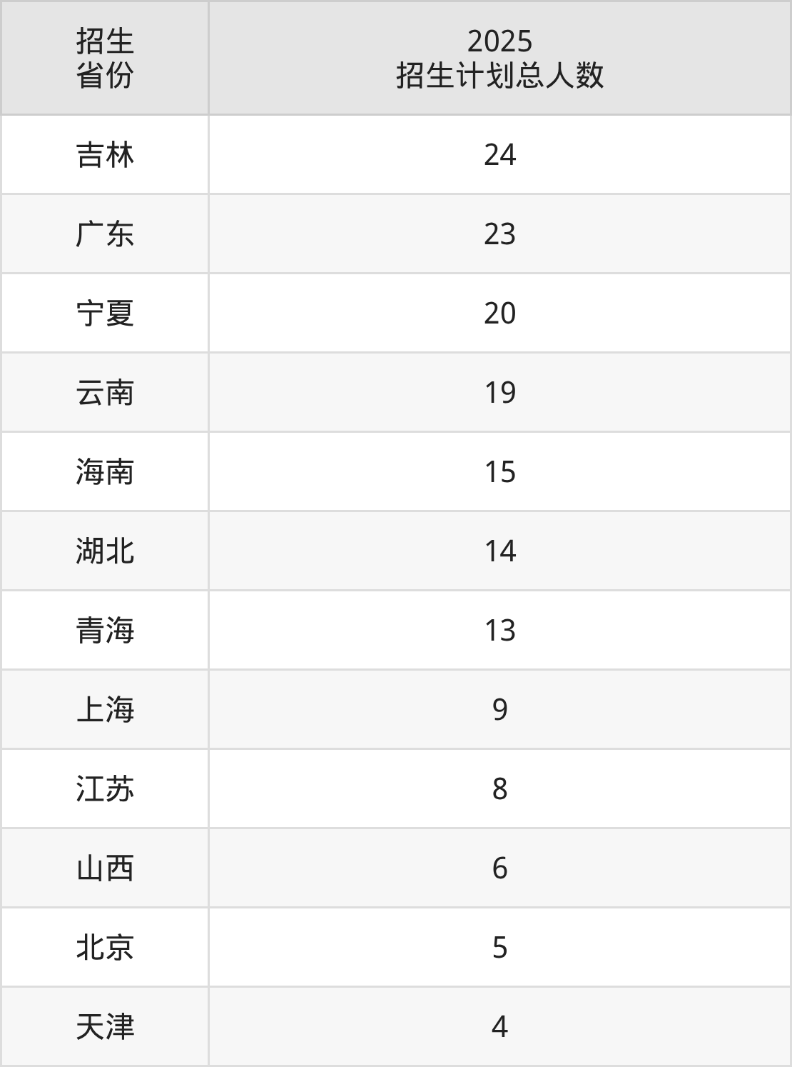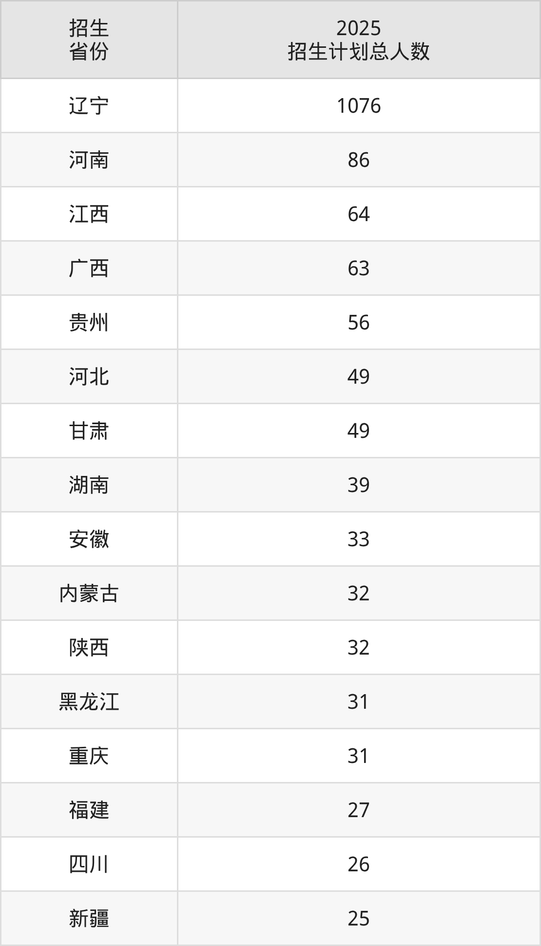 2025年大连医科大学面向全国28个省市开展本科招生;招生专业共23个,招生人数共1879人。2025年在辽宁省招生计划总人数是1076人,其中,大连医科大学在辽宁省招生人数最多的是临床医学。大连医科大学在各省具体招生人数情况如下表。