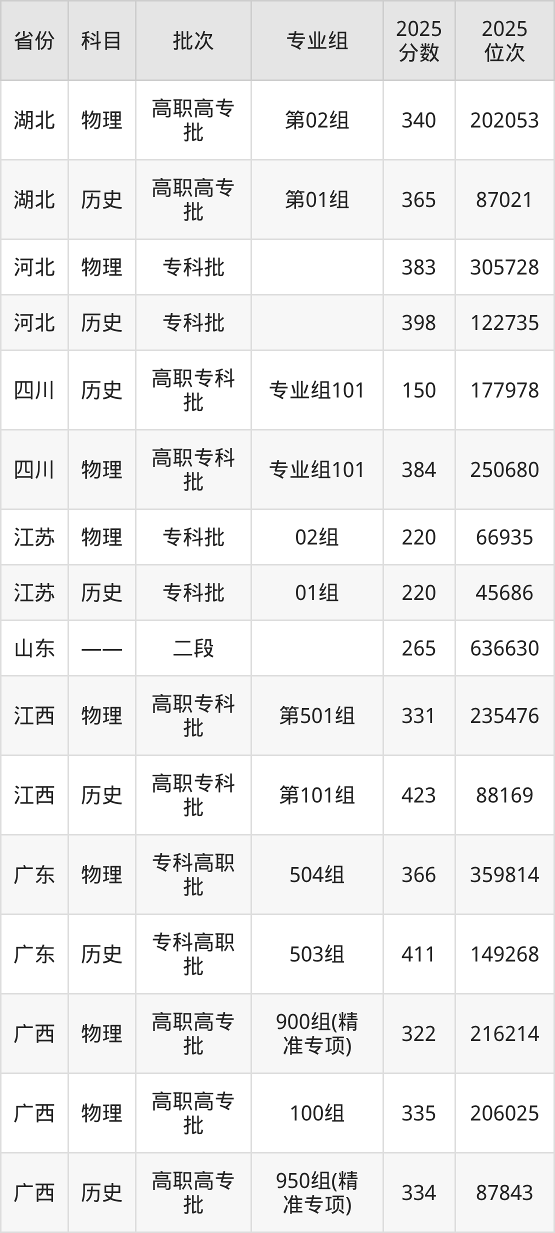 普通类专科物理类最低383分,专科历史类最低398分