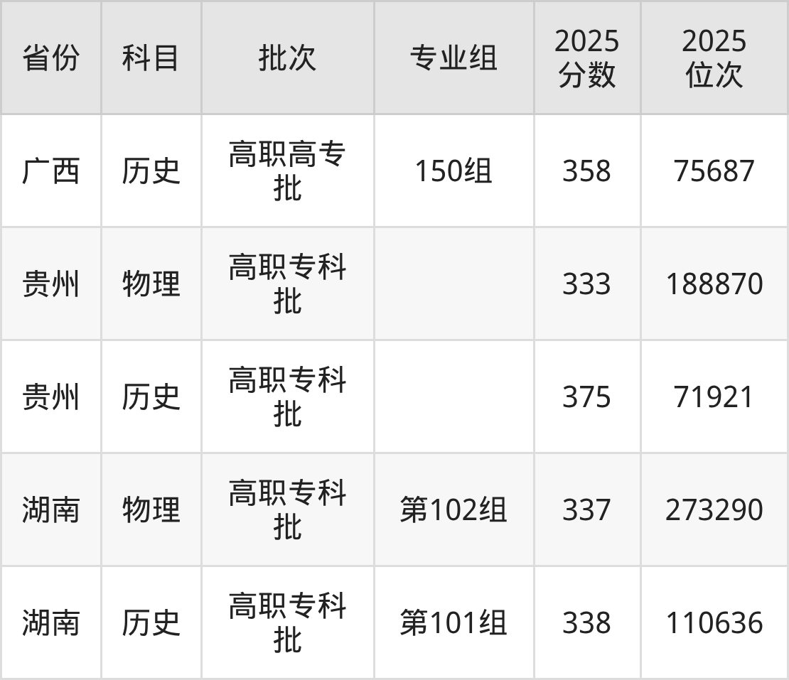 广西建设职业技术学院专业组101:2025年投档录取最低分为150分,录取最低位次为177978名。