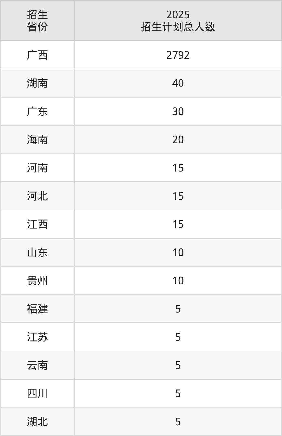 2025年广西建设职业技术学院面向全国14个省市开展专科招生;招生专业共39个,招生人数共2972人。2025年在广西壮族自治区招生计划总人数是2792人,其中,广西建设职业技术学院在广西壮族自治区招生人数最多的是智能建造技术。广西建设职业技术学院在各省具体招生人数情况如下表。