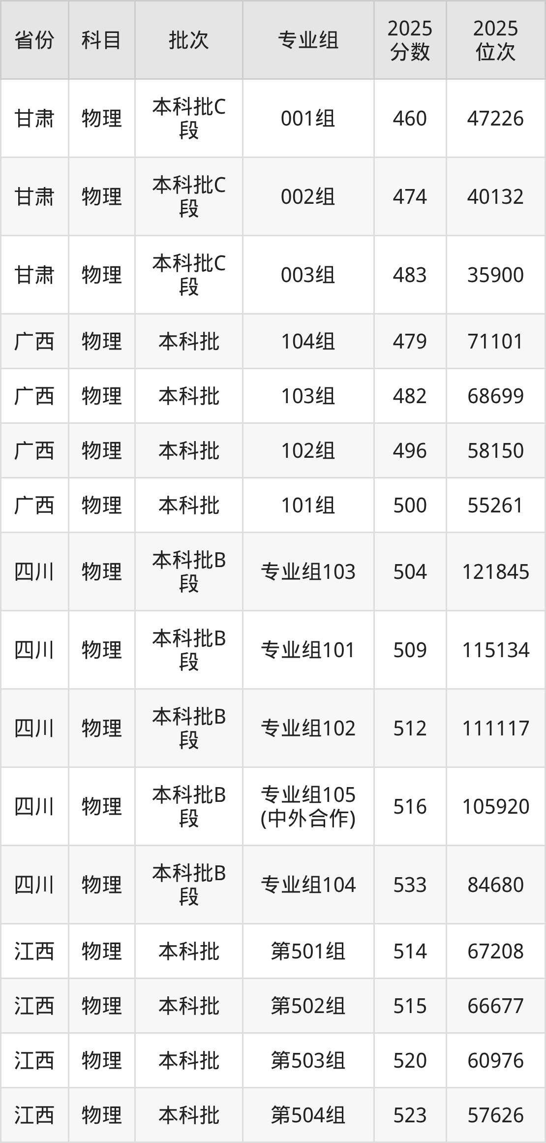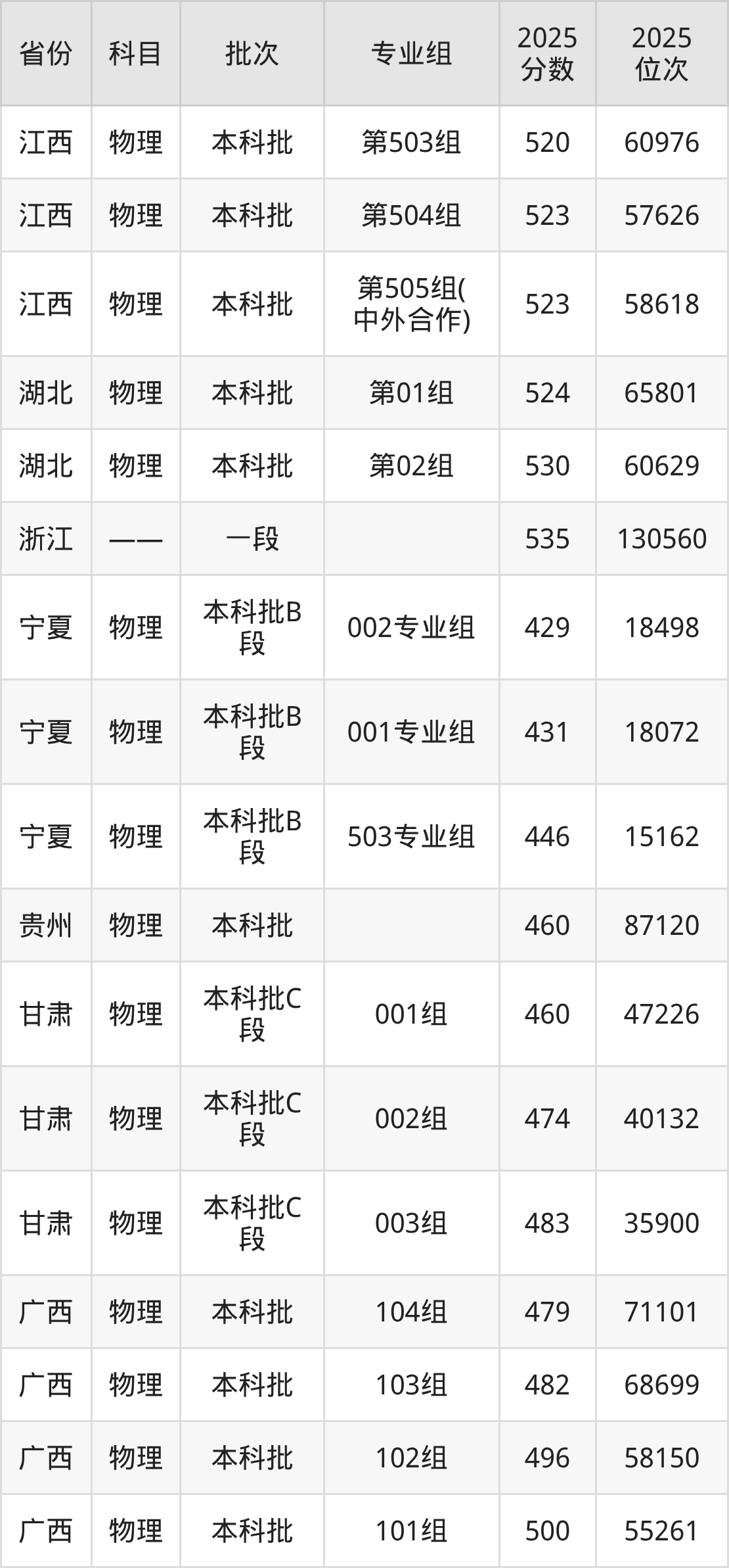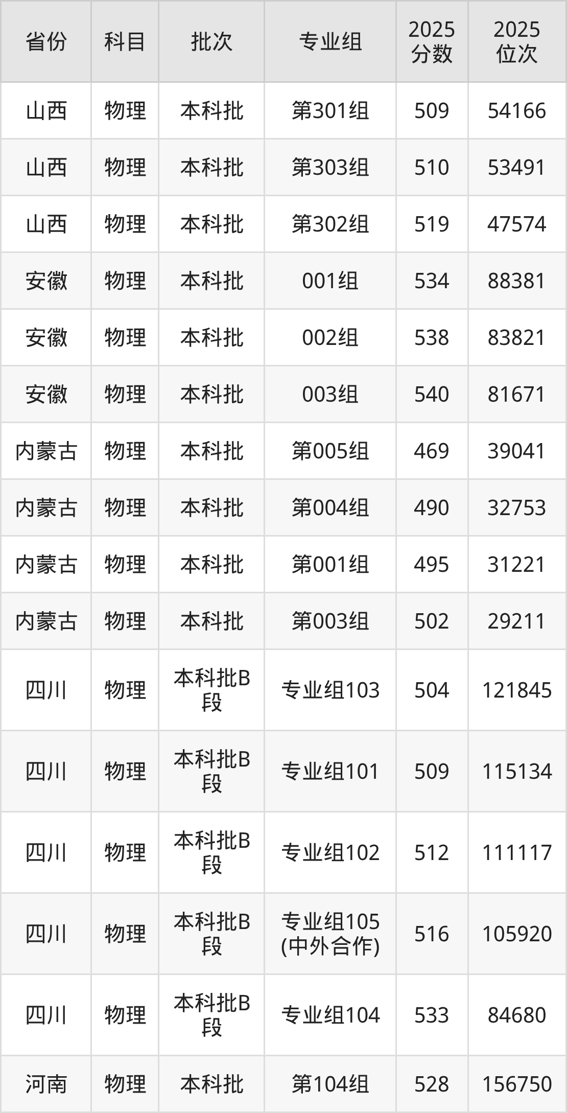 2025年在本科物理类进行招生,各专业组分数线详情如下: