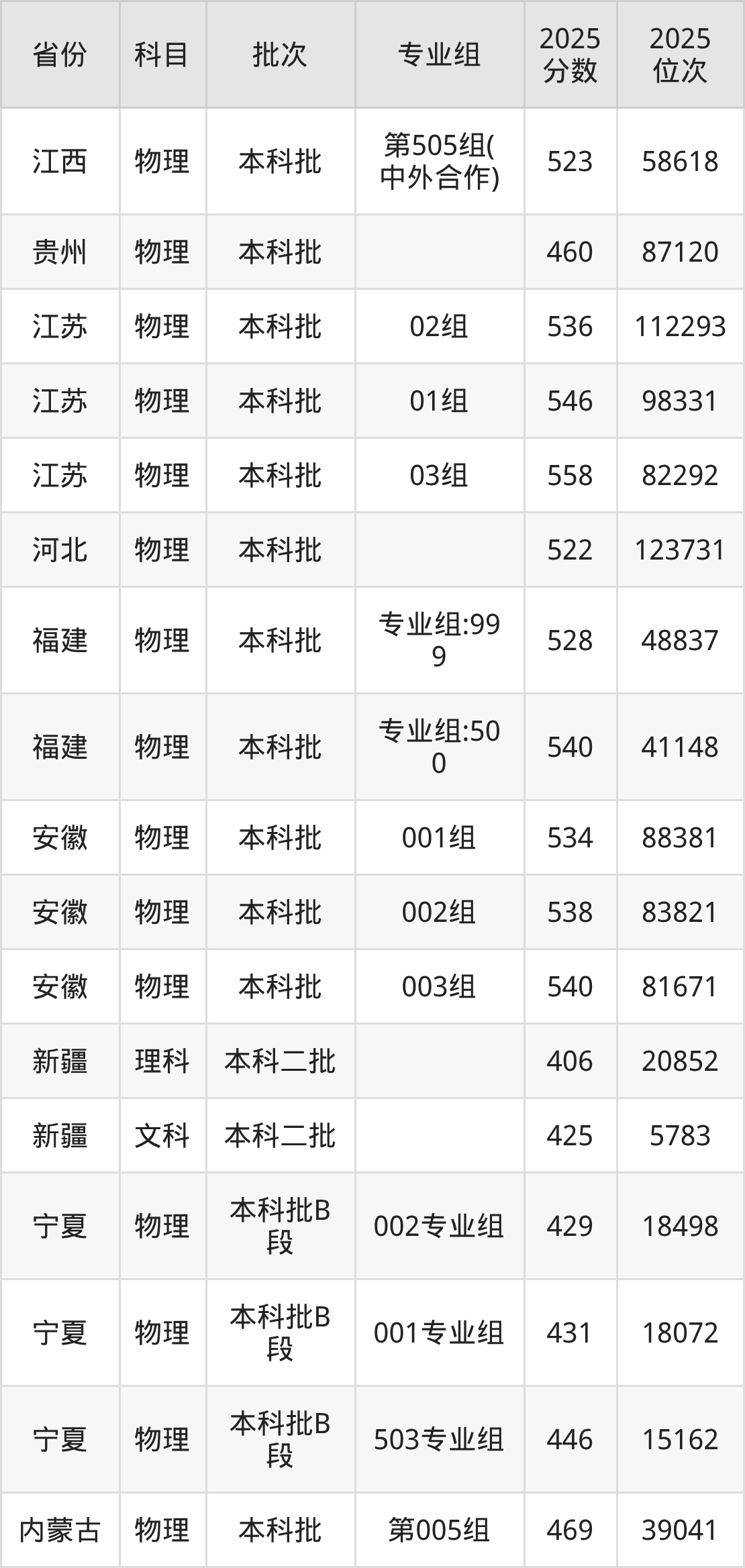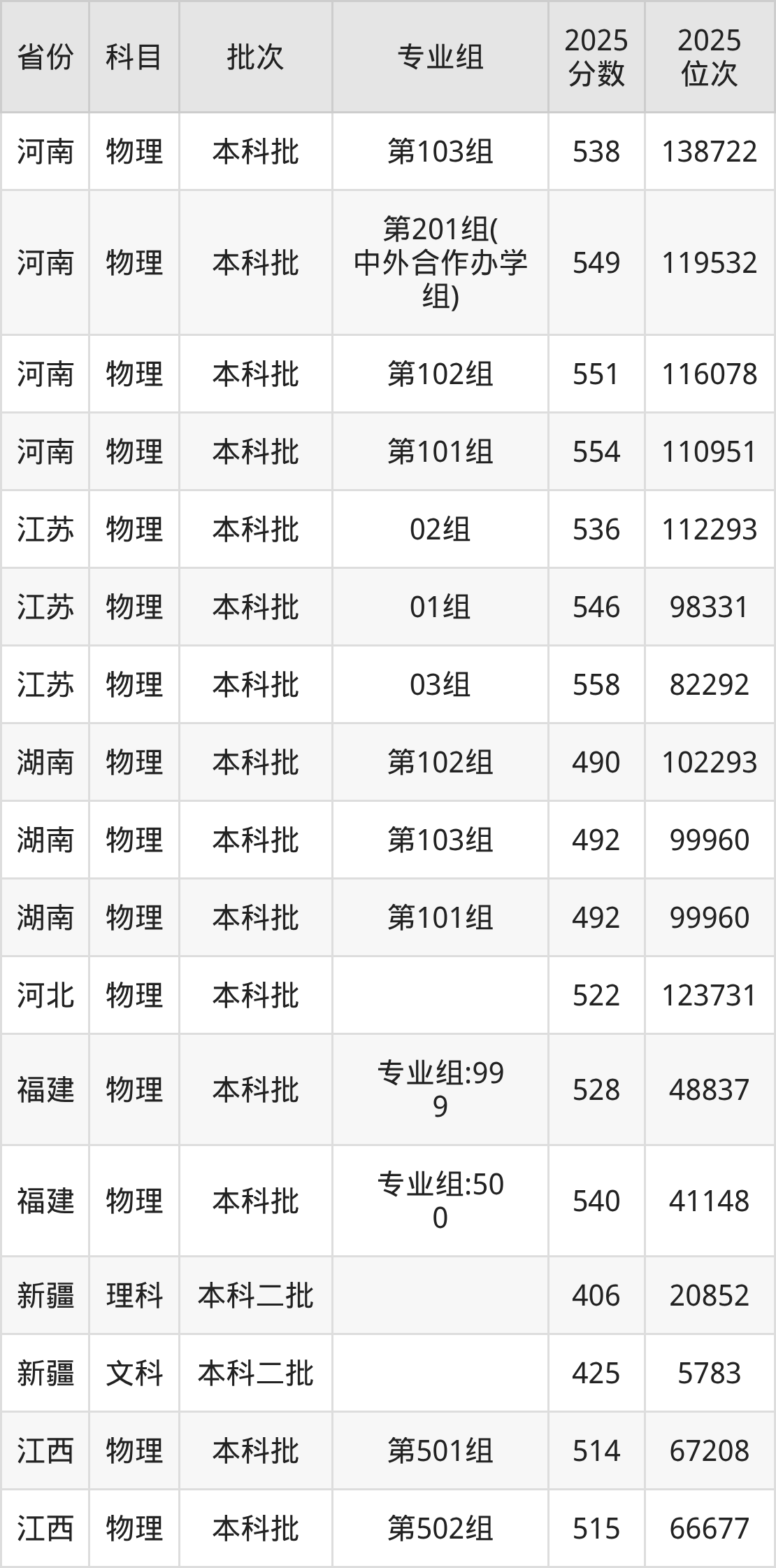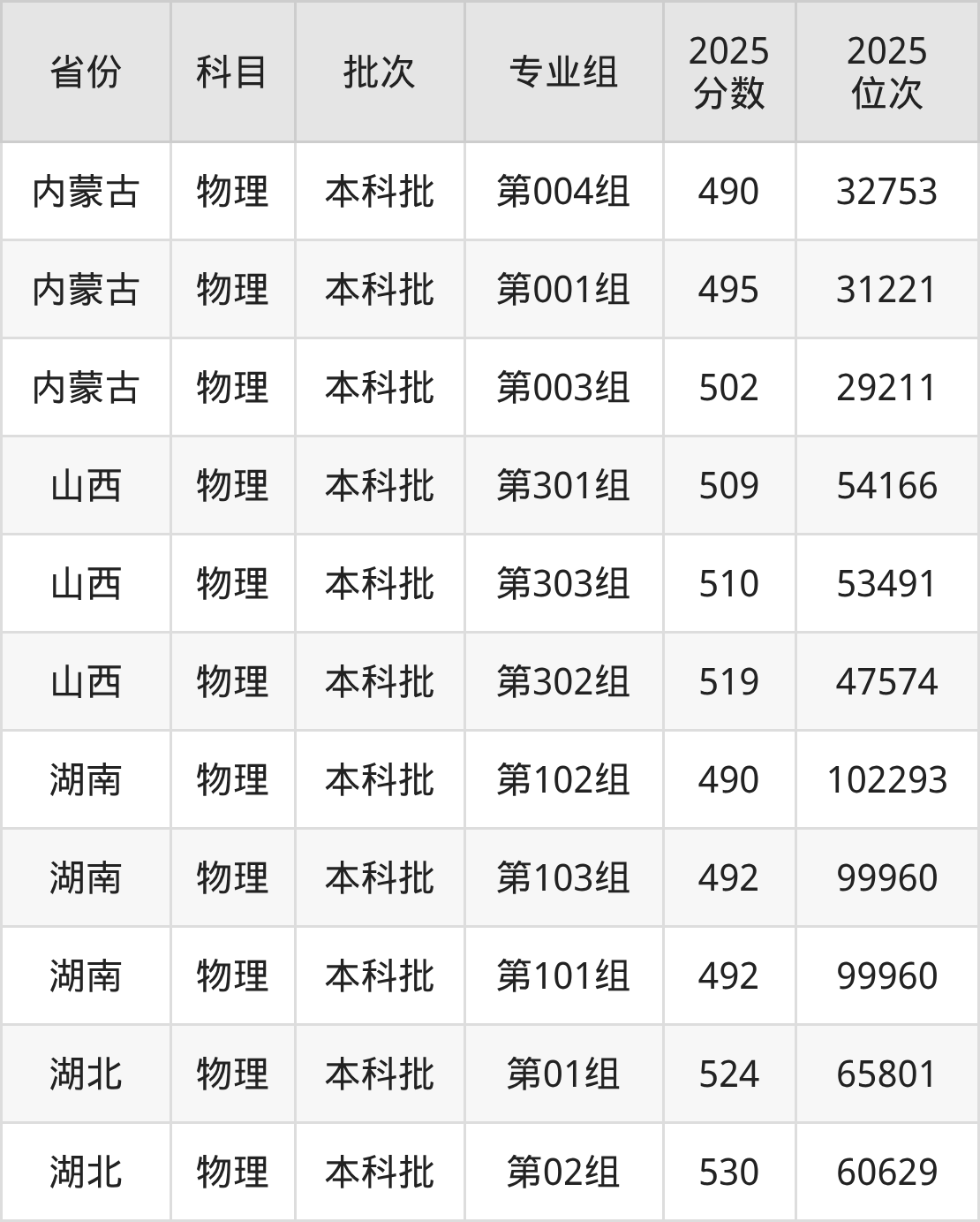 2025年在本科物理类进行招生,各专业组分数线详情如下: