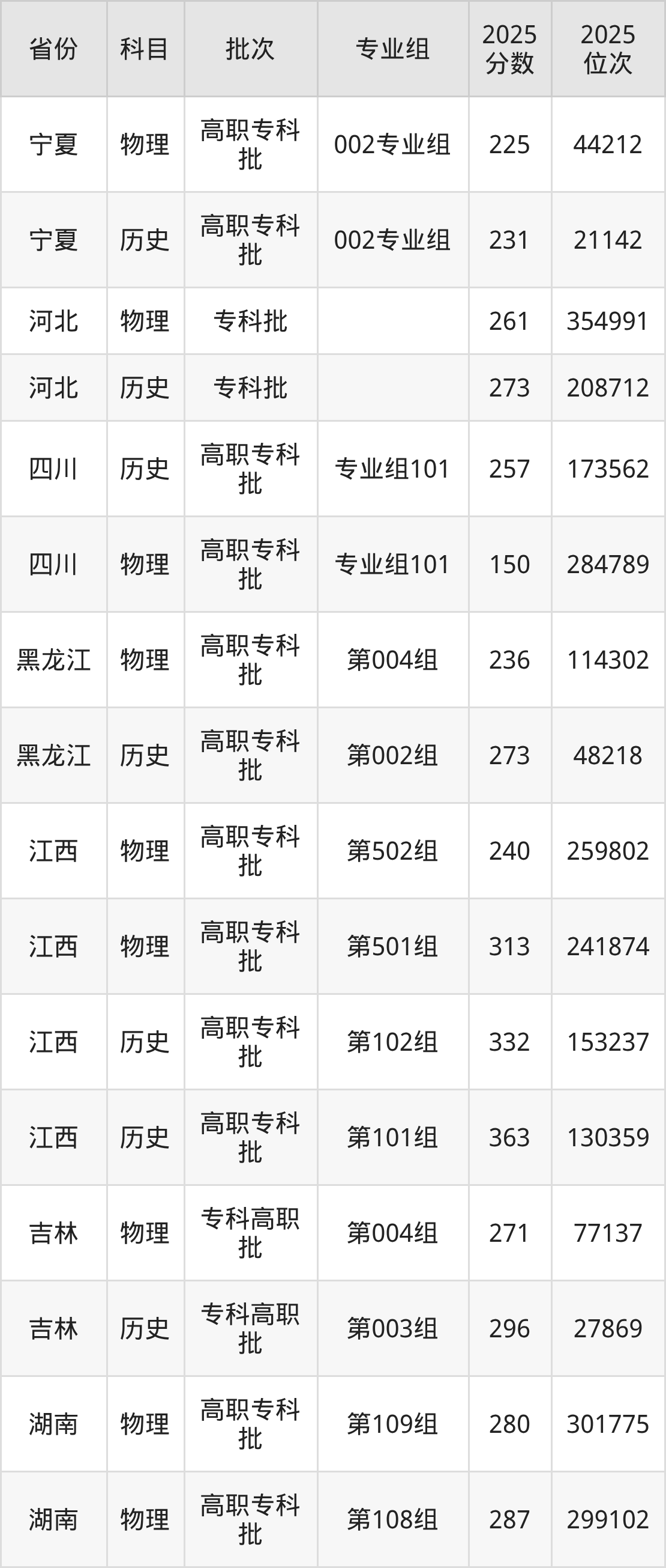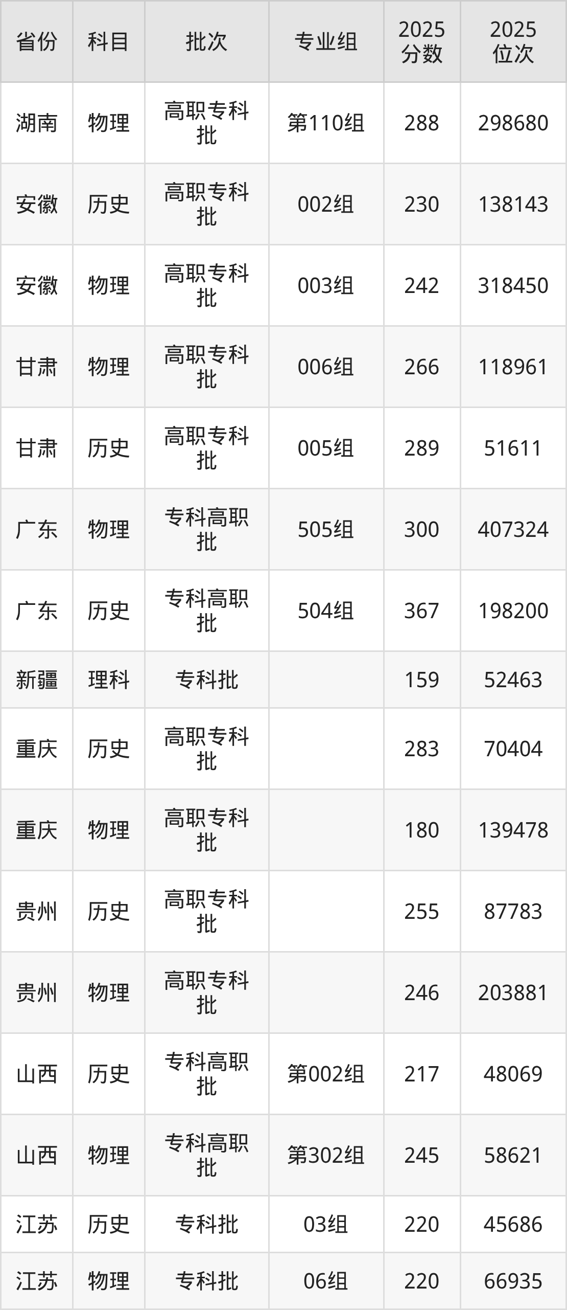 2025年在专科物理类进行招生,各专业组分数线详情如下: