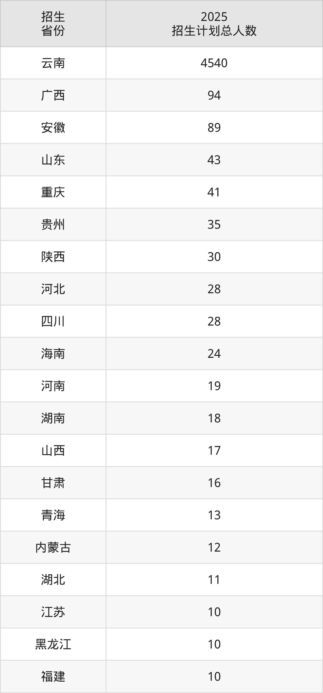 2025年云南民族大学面向全国28个省市开展本科招生;招生专业共63个,招生人数共5145人。2025年在云南省招生计划总人数是4540人,其中,云南民族大学在云南省招生人数最多的是汉语言文学。云南民族大学在各省具体招生人数情况如下表。