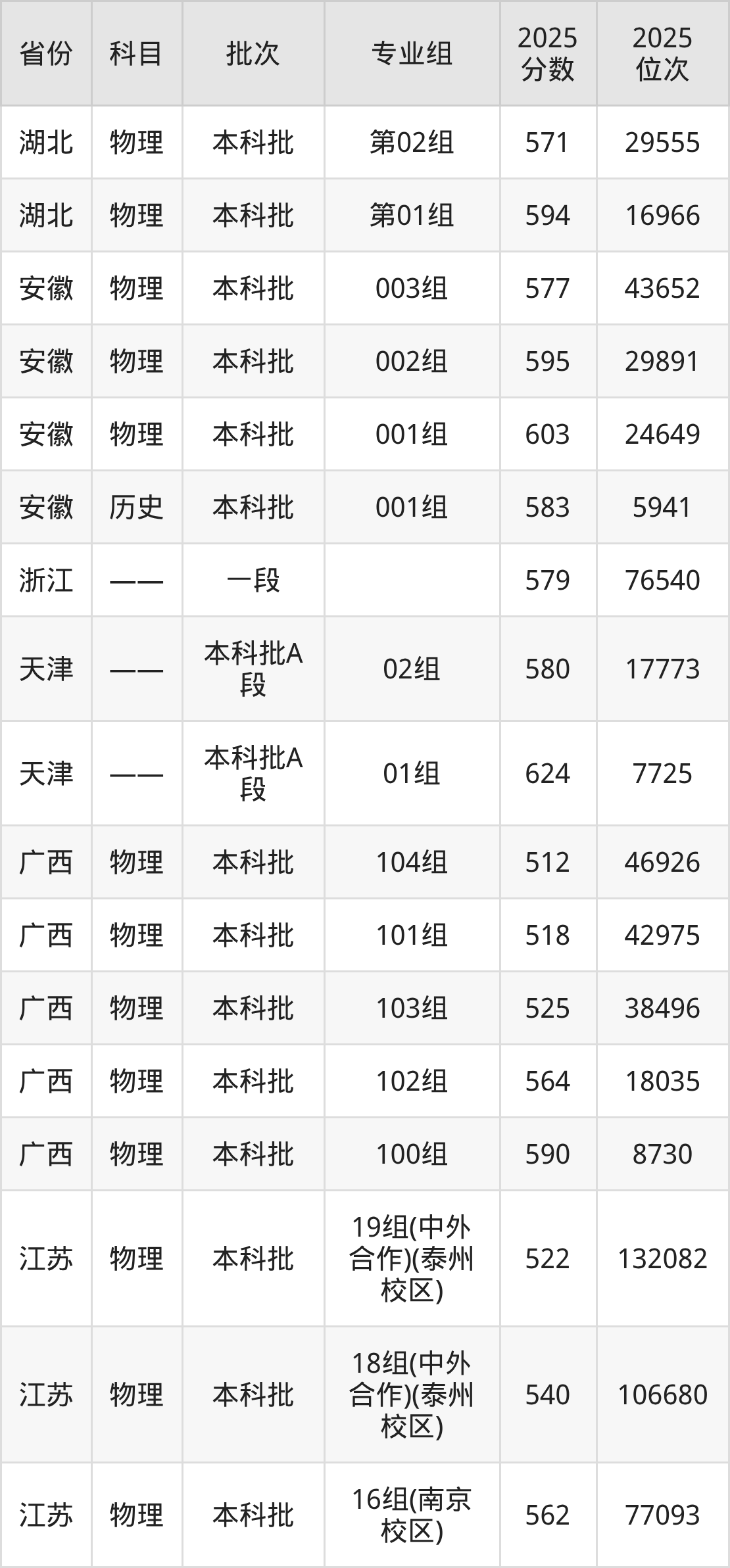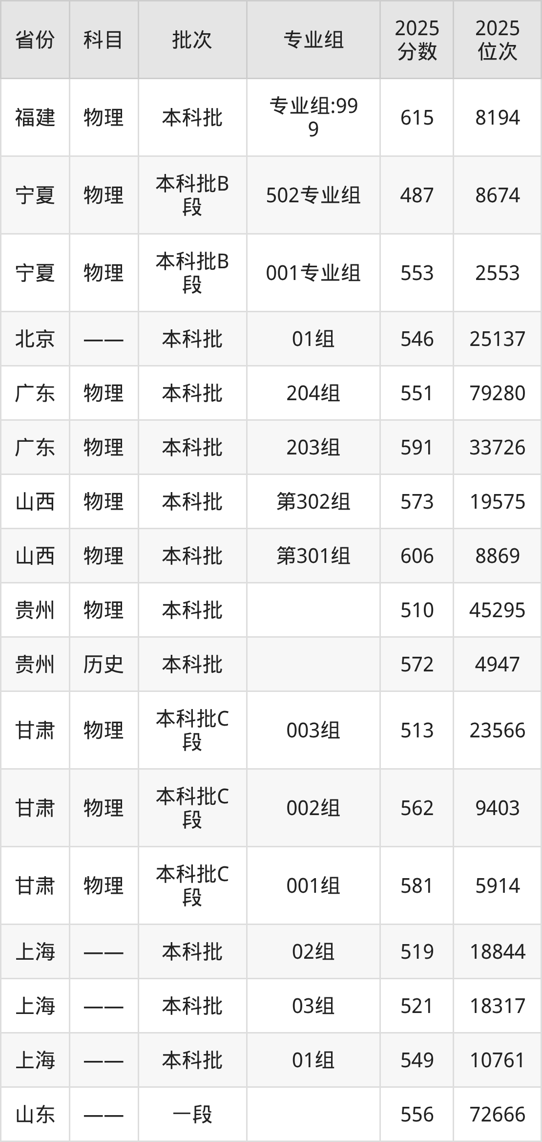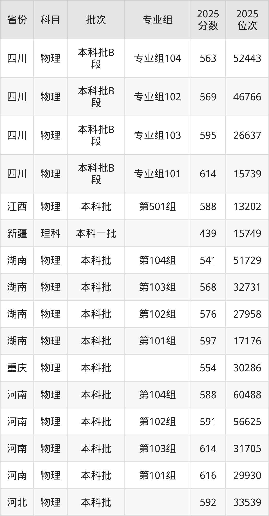 2025年在本科物理类进行招生,各专业组分数线详情如下: