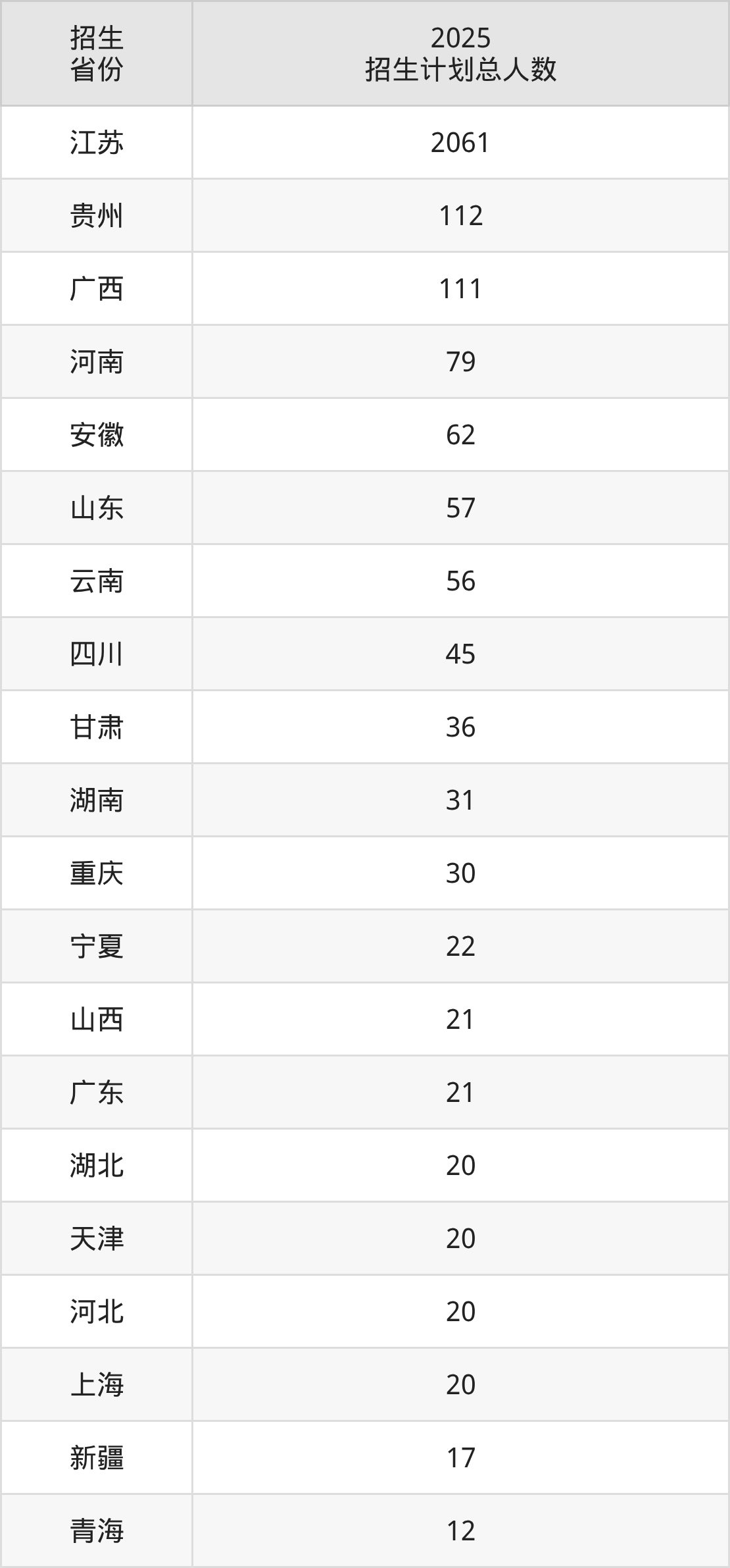 2025年南京中医药大学面向全国24个省市开展本科招生;招生专业共21个,招生人数共2883人。2025年在江苏省招生计划总人数是2061人,其中,南京中医药大学在江苏省招生人数最多的是生物制药。南京中医药大学在各省具体招生人数情况如下表。