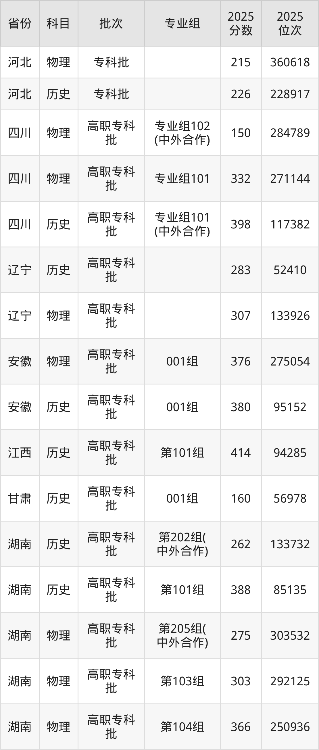 2025年长春师范高等专科学校全国录取分数线是150分到449分,录取最低在四川物理类(专业组102(中外合作))、录取最高在河北历史类。各省各专业组最低分具有差异,详情如下: