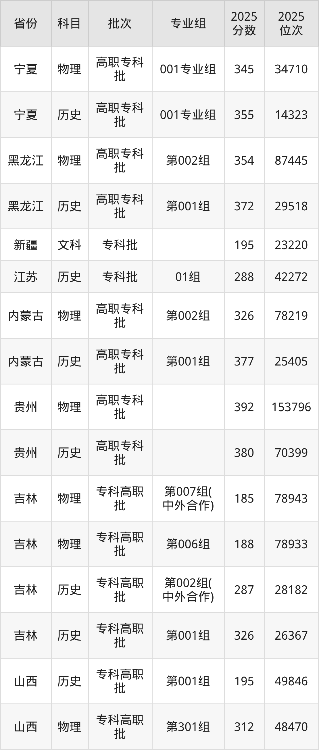 普通类专科物理类最低345分,专科历史类最低355分