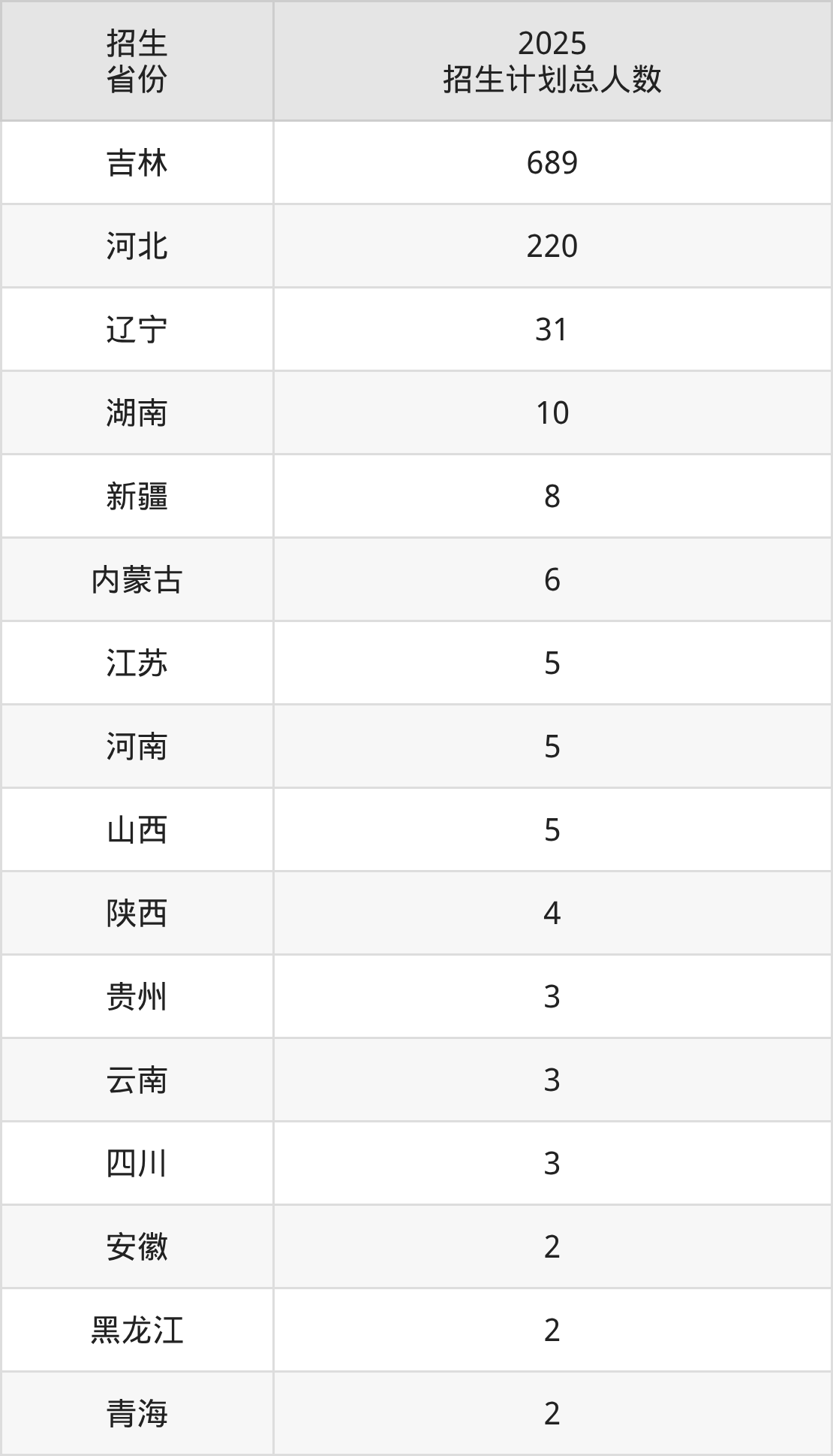 2025年长春师范高等专科学校面向全国19个省市开展专科招生;招生专业共26个,招生人数共1002人。2025年在吉林省招生计划总人数是689人,其中,长春师范高等专科学校在吉林省招生人数最多的是特殊教育。长春师范高等专科学校在各省具体招生人数情况如下表。