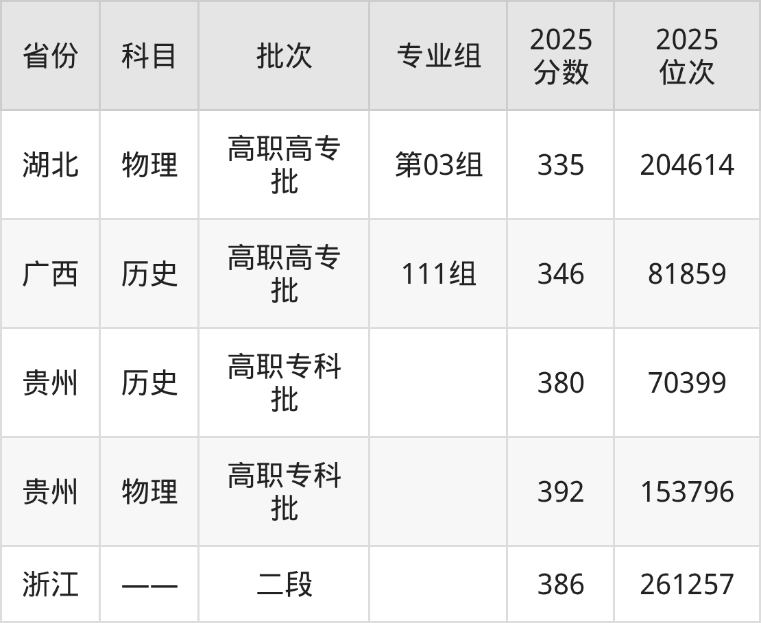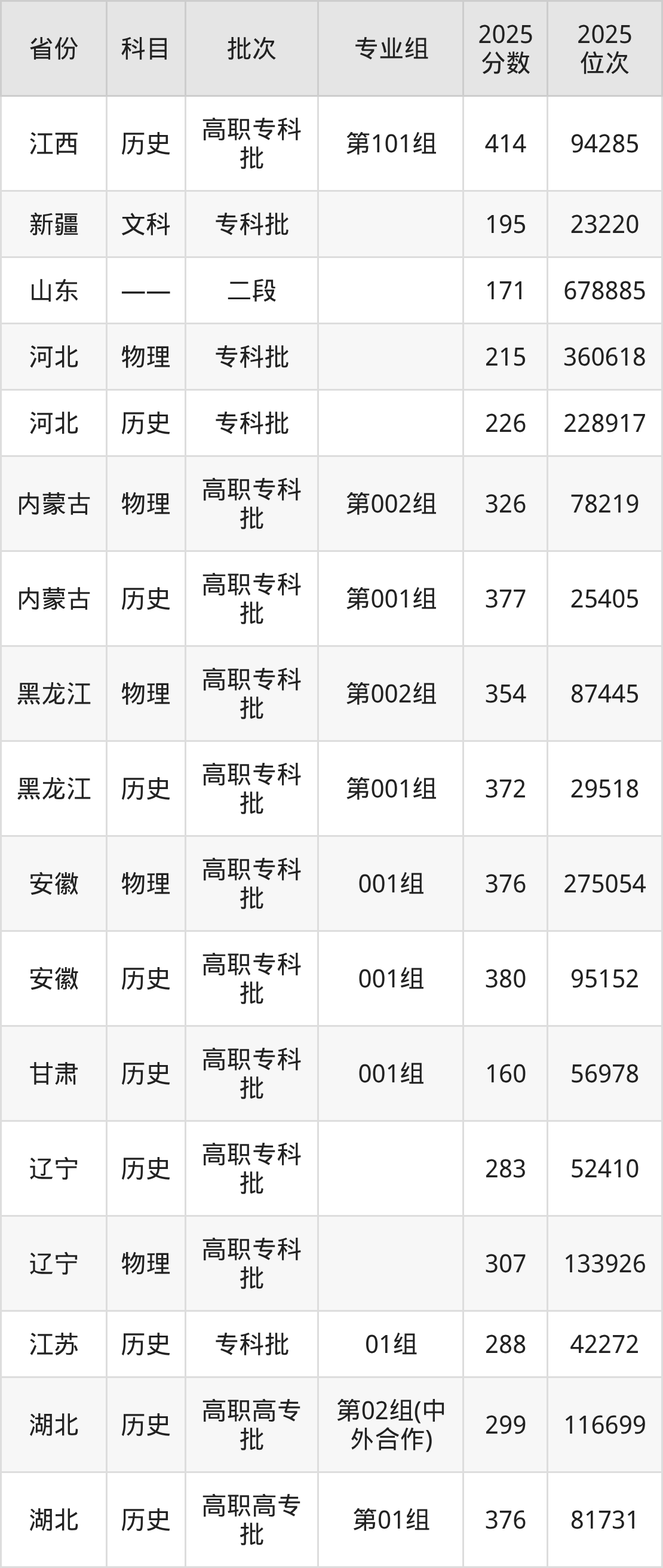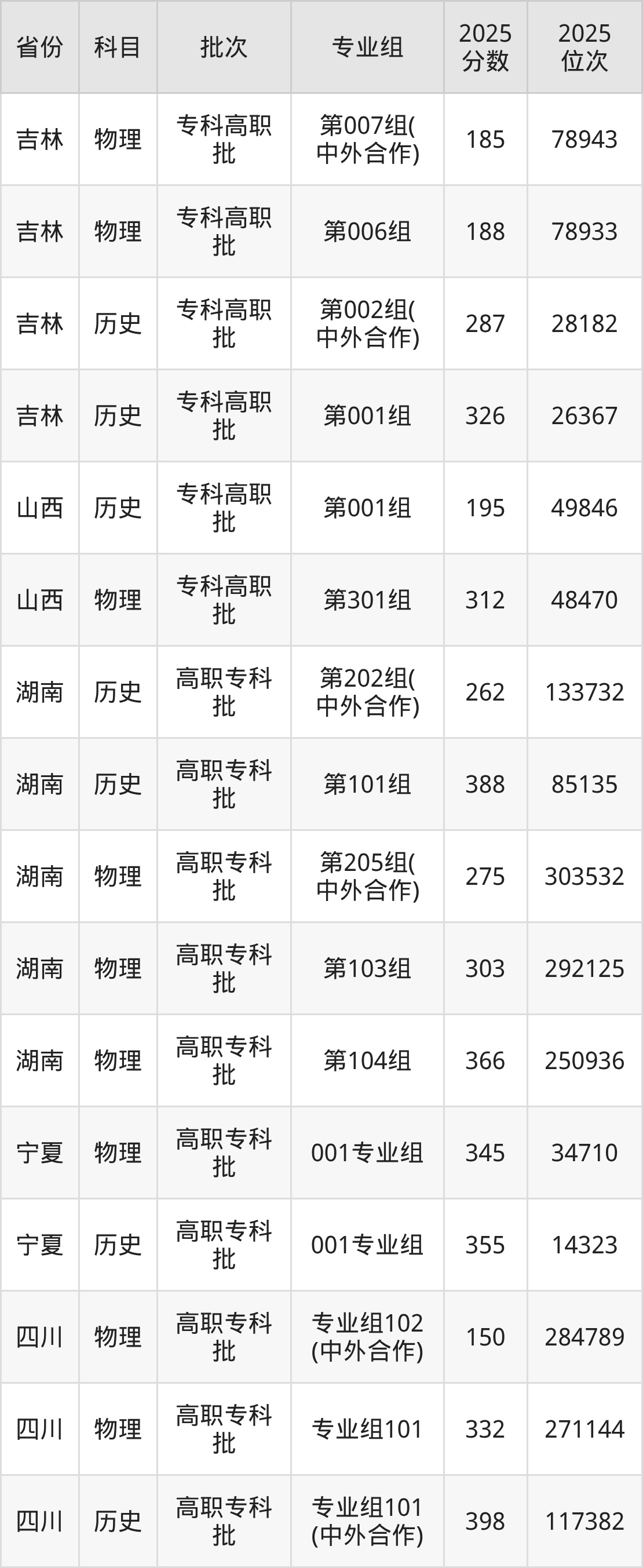 2025年在专科历史类进行招生,各专业组分数线详情如下: