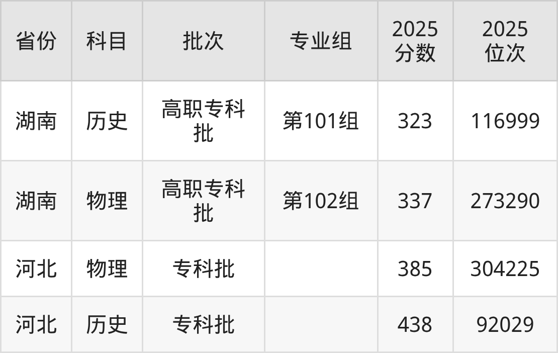 菏泽职业学院2025招生录取分数线已公布,2025年菏泽职业学院在湖南省专科历史类投档录取最低分323分。在河北省专科历史类投档录取最低分438分,更多省份具体录取分数线详见下文。