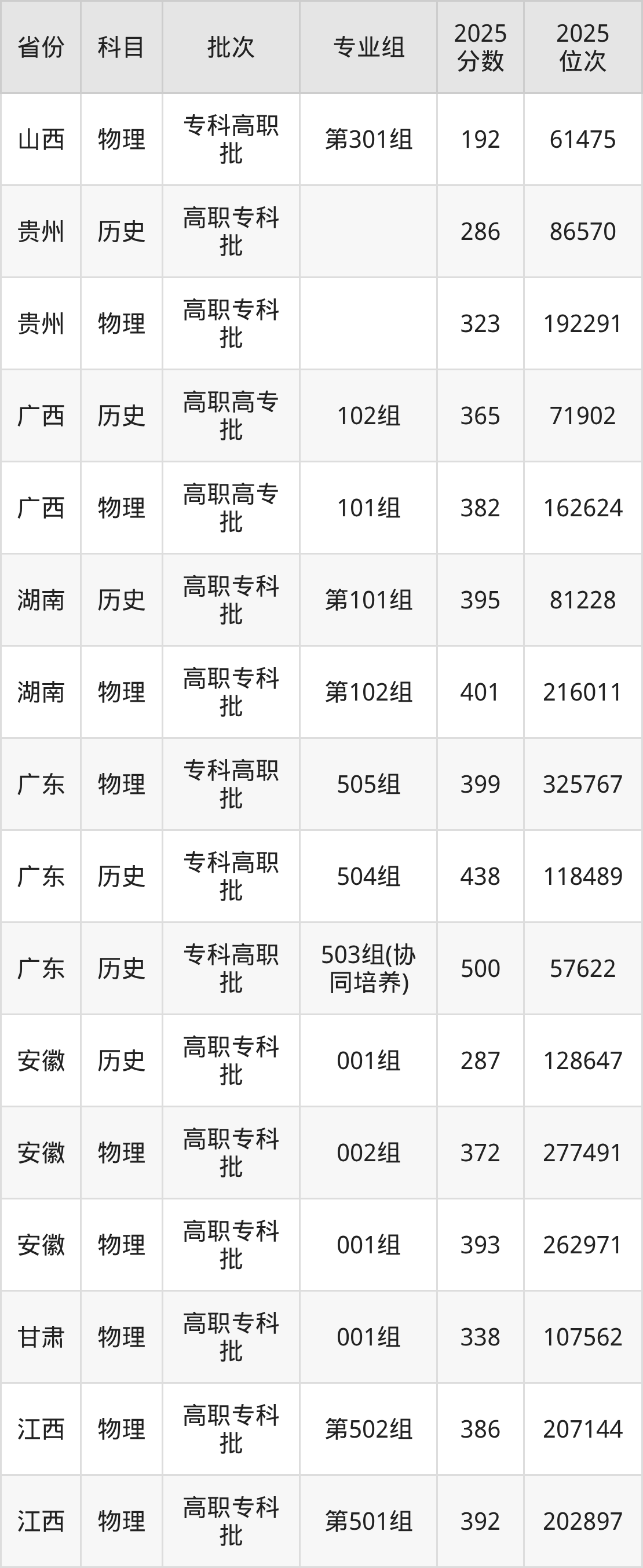 2025年在专科物理类进行招生,各专业组分数线详情如下: