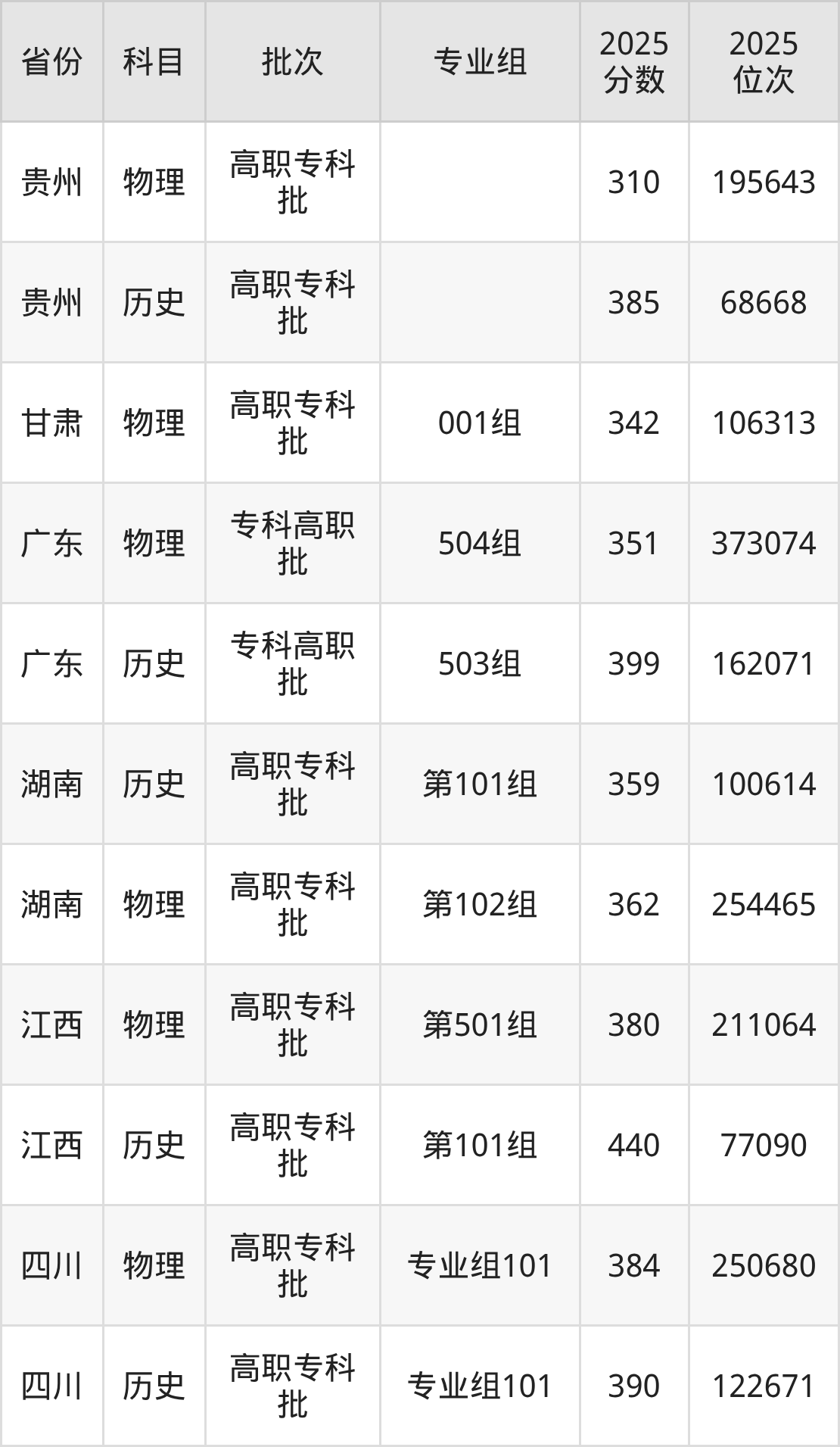 2025年湖南有色金属职业技术学院全国录取分数线是310分到440分,录取最低在贵州物理类、录取最高在江西历史类(第101组)。各省各专业组最低分具有差异,详情如下: