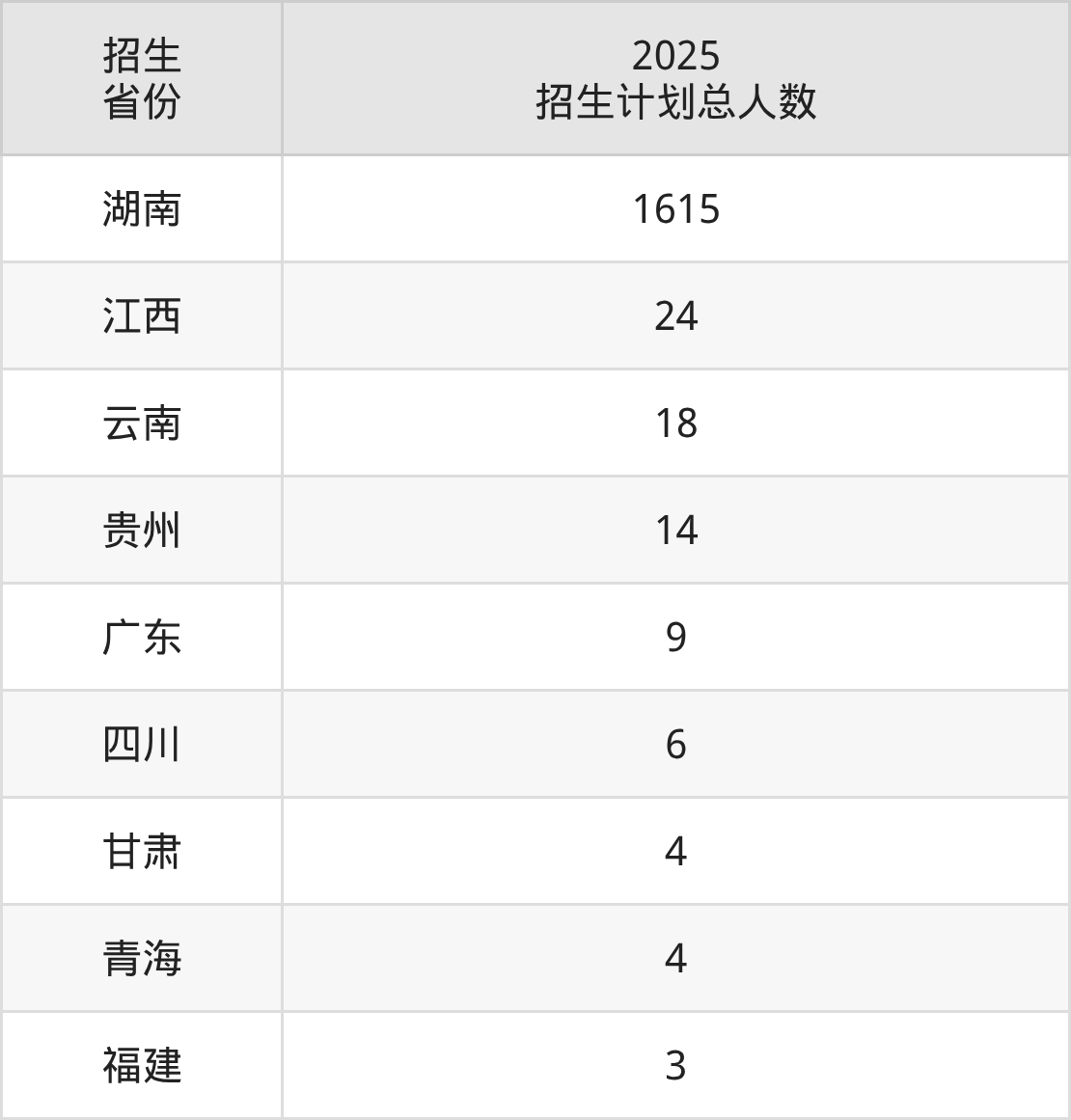 2025年湖南有色金属职业技术学院面向全国9个省市开展专科招生;招生专业共23个,招生人数共1697人。2025年在湖南省招生计划总人数是1615人,其中,湖南有色金属职业技术学院在湖南省招生人数最多的是分析检验技术。湖南有色金属职业技术学院在各省具体招生人数情况如下表。
