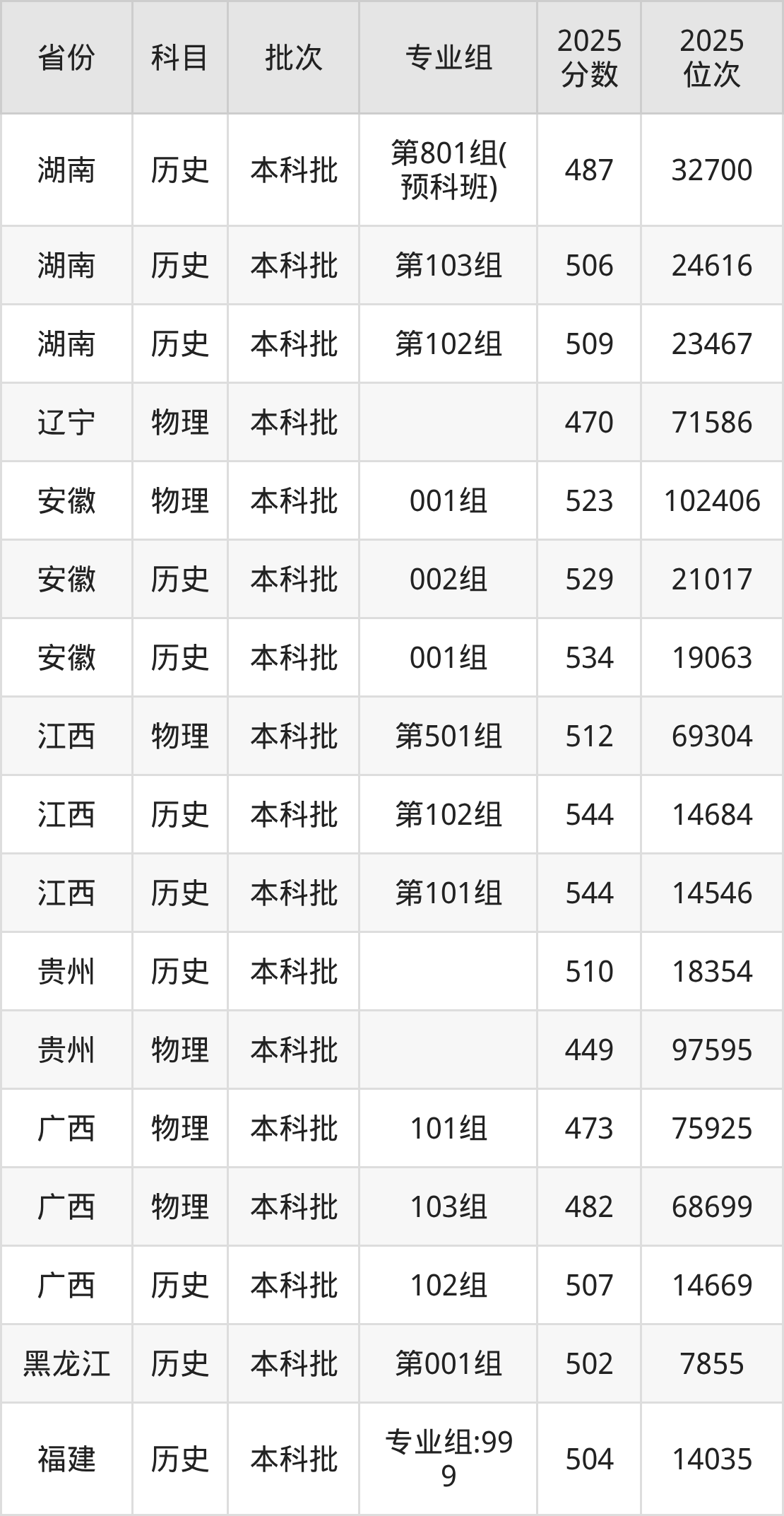 2025年在本科历史类进行招生,各专业组分数线详情如下:
