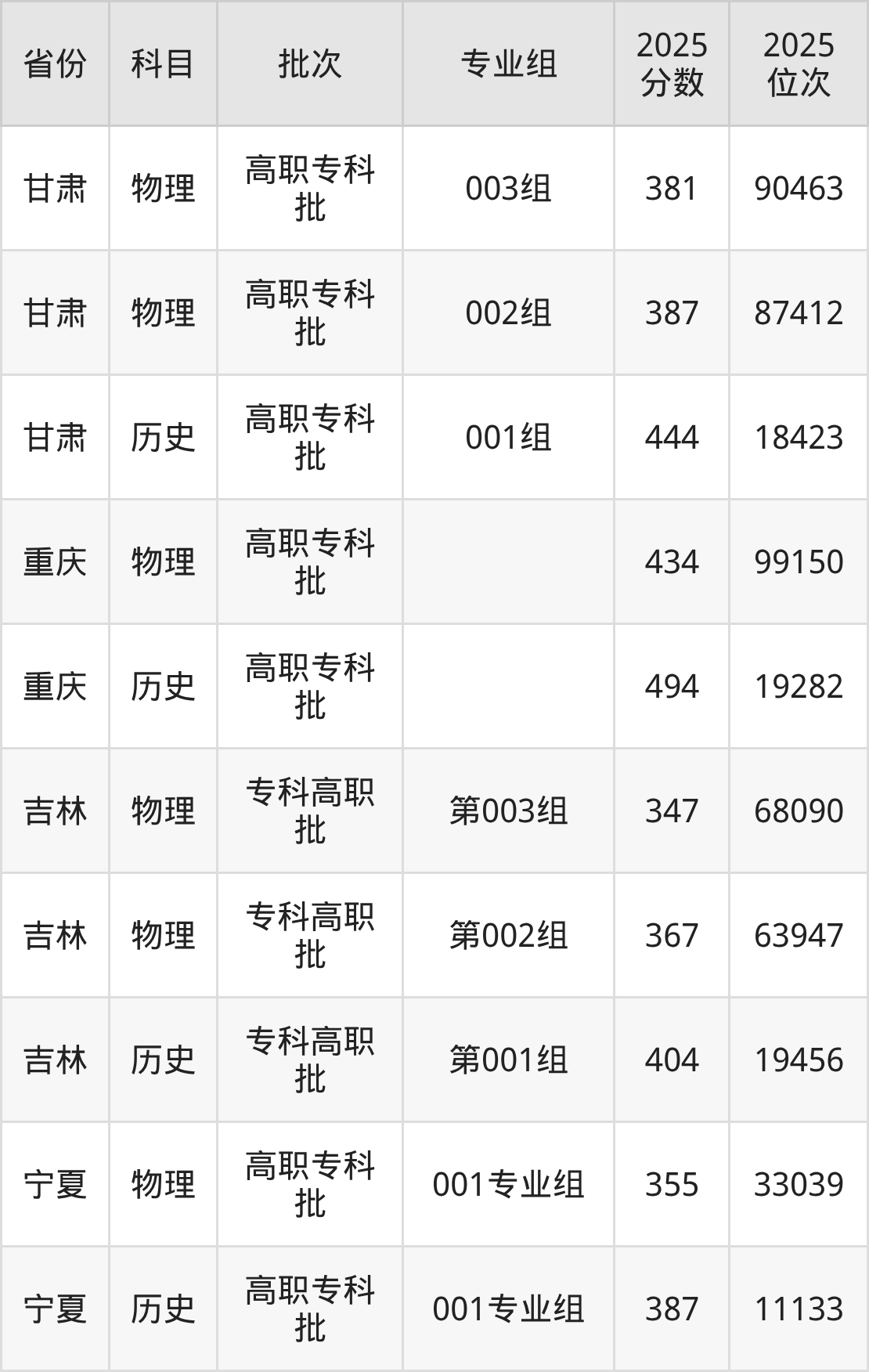 2025年武汉海事职业学院全国录取分数线是347分到494分,录取最低在吉林物理类(第003组)、录取最高在重庆历史类。各省各专业组最低分具有差异,详情如下: