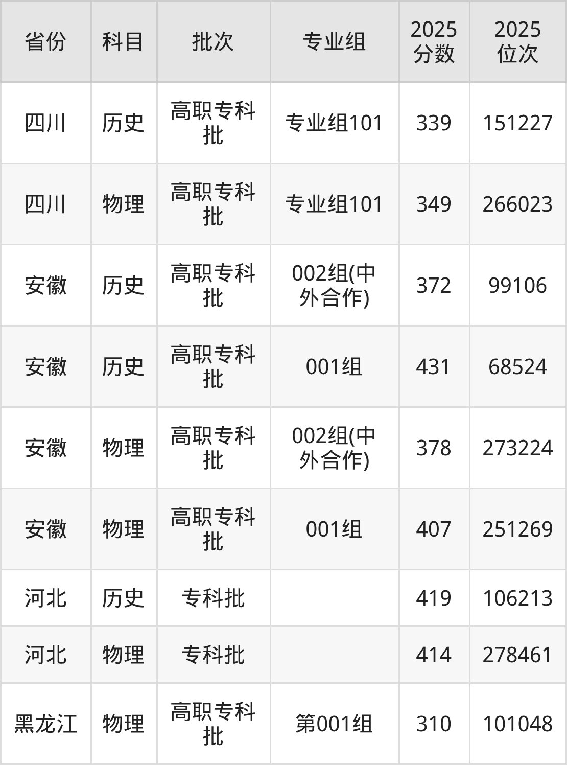 2025年在专科物理类进行招生,各专业组分数线详情如下: