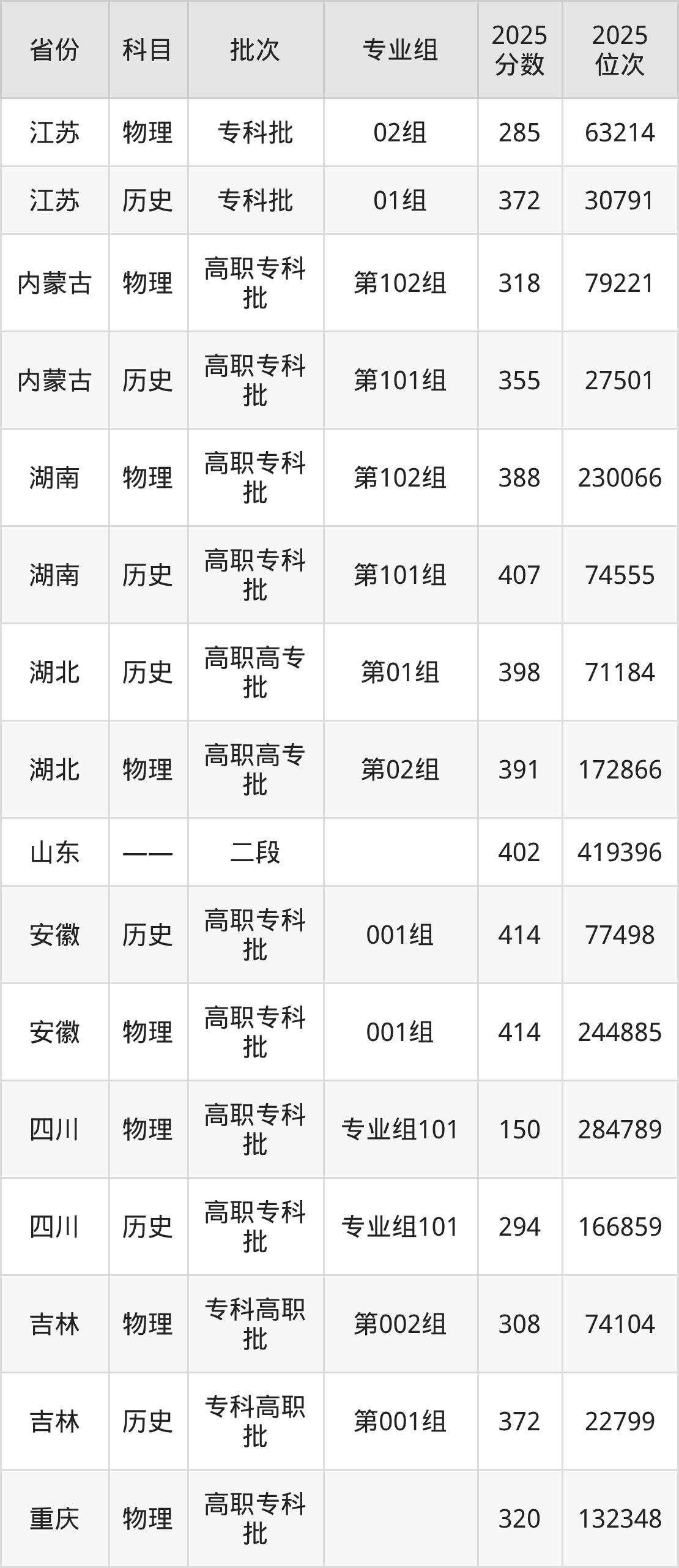 普通类专科物理类最低382分,专科历史类最低426分