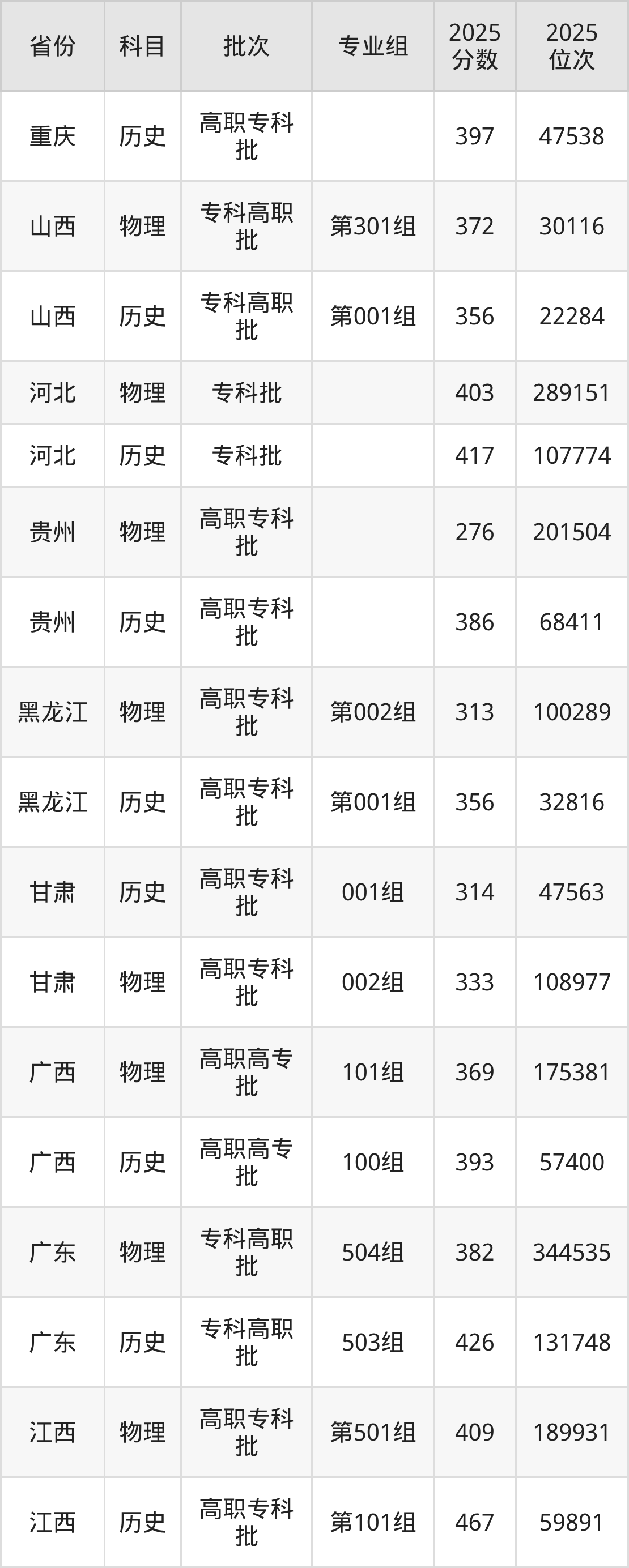 九江职业大学001专业组:2025年投档录取最低分为314分,录取最低位次为47563名。