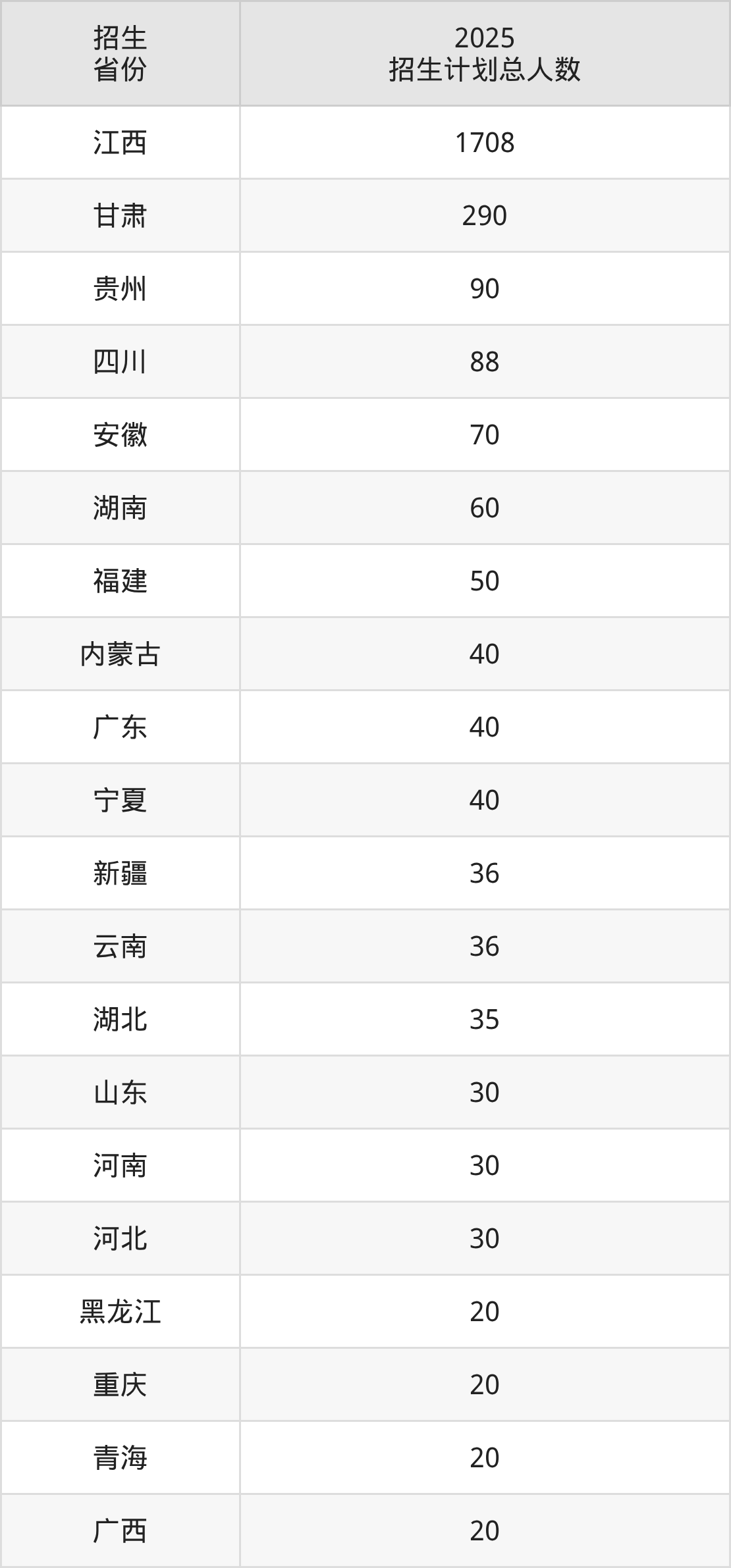 2025年九江职业大学面向全国25个省市开展专科招生;招生专业共42个,招生人数共2803人。2025年在江西省招生计划总人数是1708人,其中,九江职业大学在江西省招生人数最多的是机电一体化技术。九江职业大学在各省具体招生人数情况如下表。
