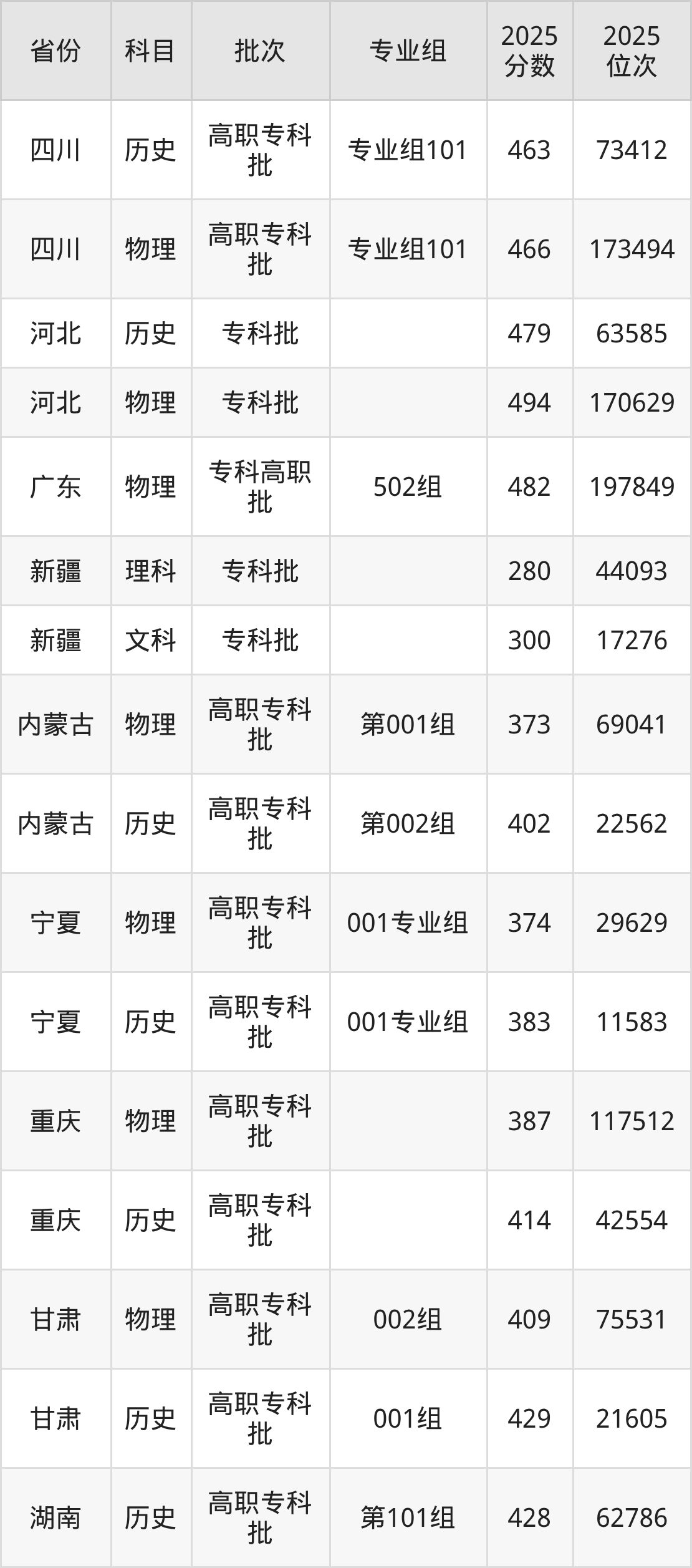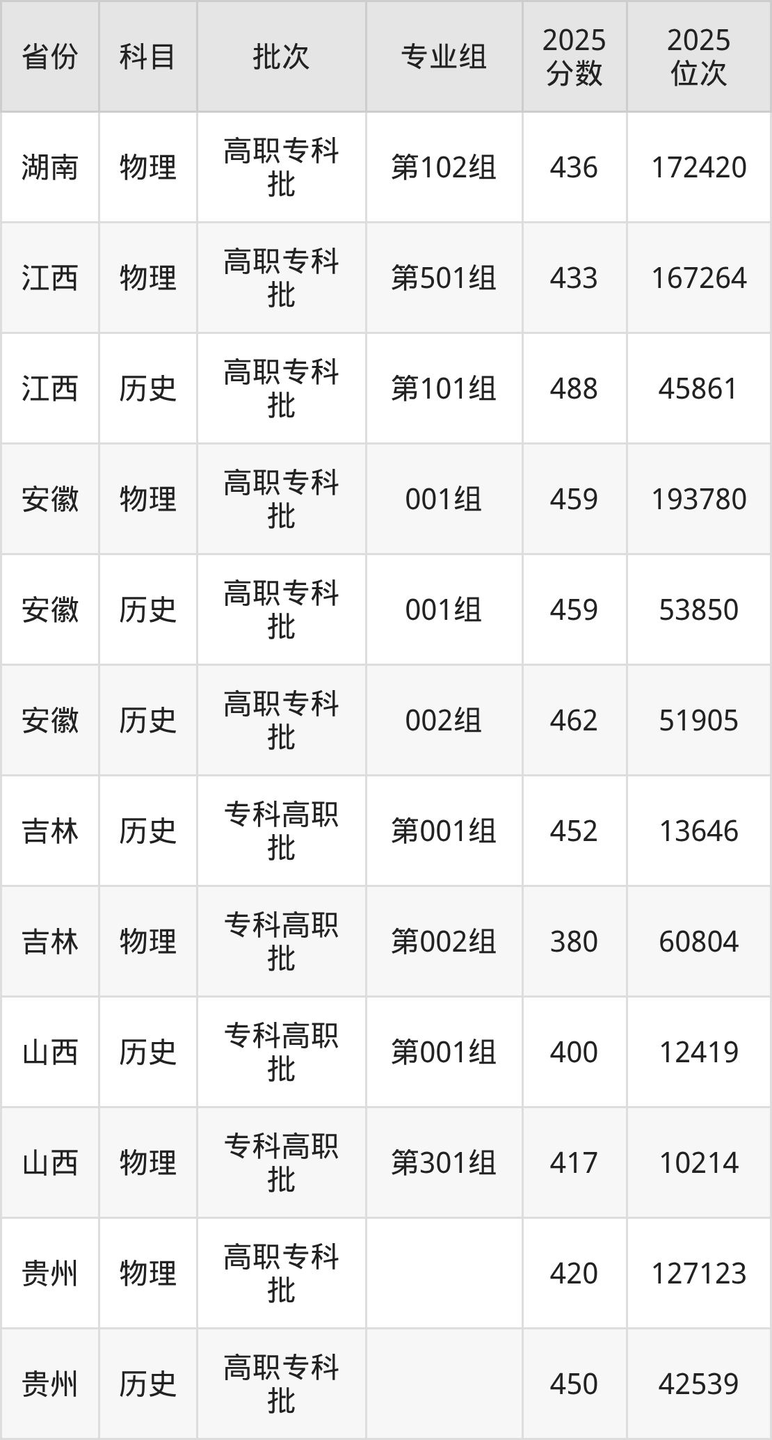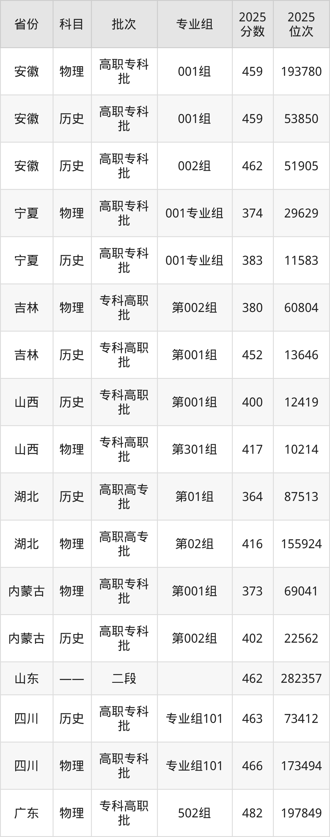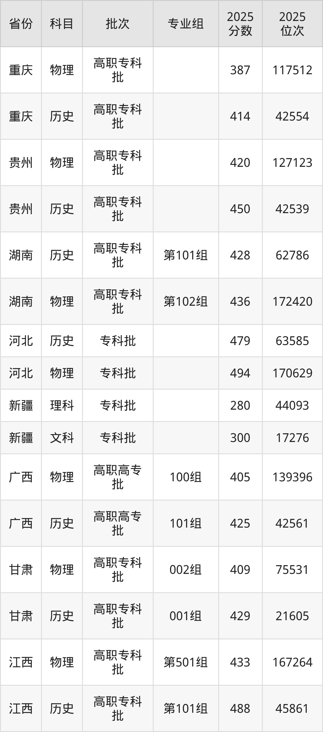 2025年在专科物理类进行招生,各专业组分数线详情如下: