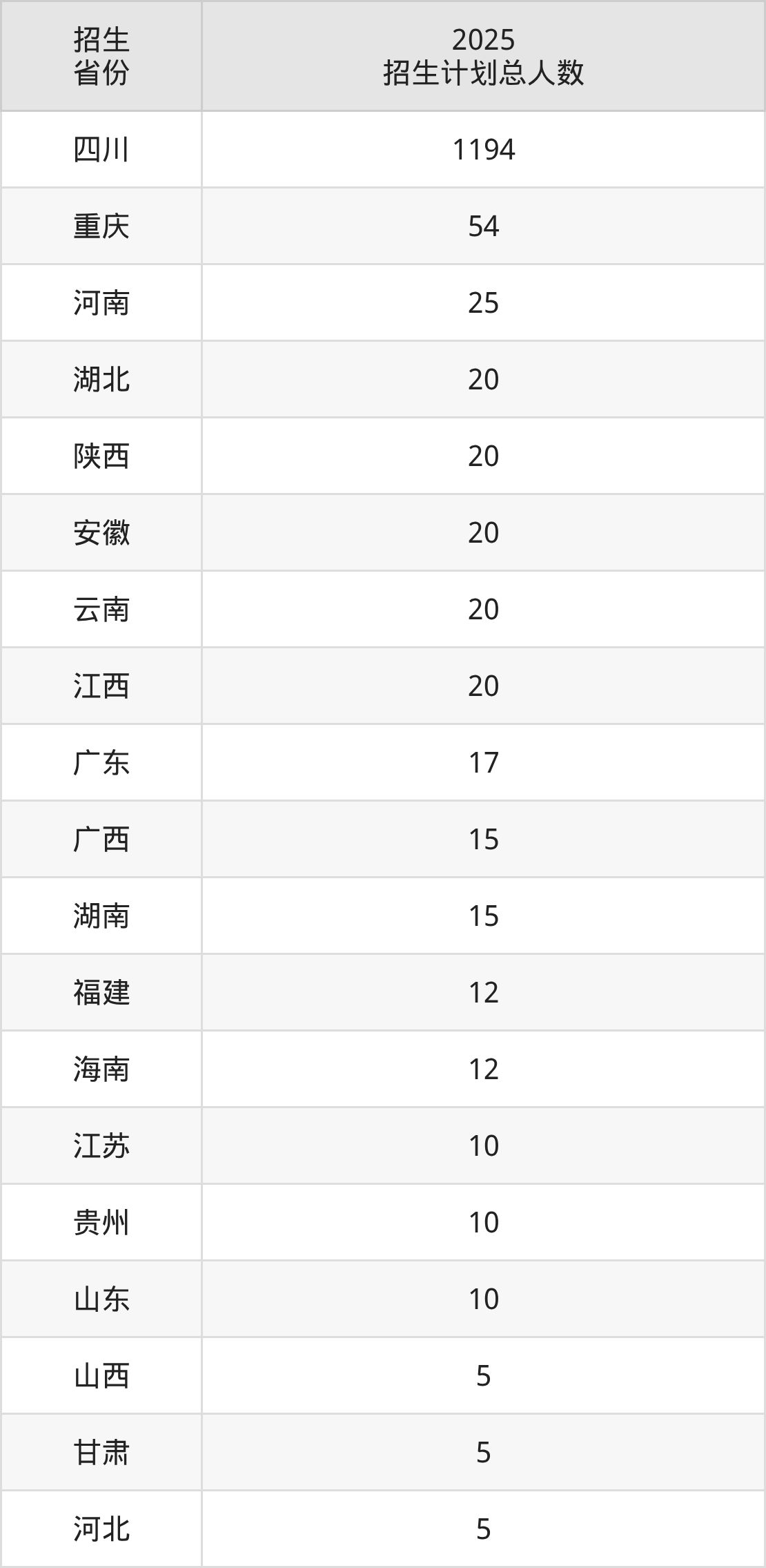 2025年成都师范学院面向全国19个省市开展本科招生;招生专业共23个,招生人数共1489人。2025年在四川省招生计划总人数是1194人,其中,成都师范学院在四川省招生人数最多的是数字经济。成都师范学院在各省具体招生人数情况如下表。