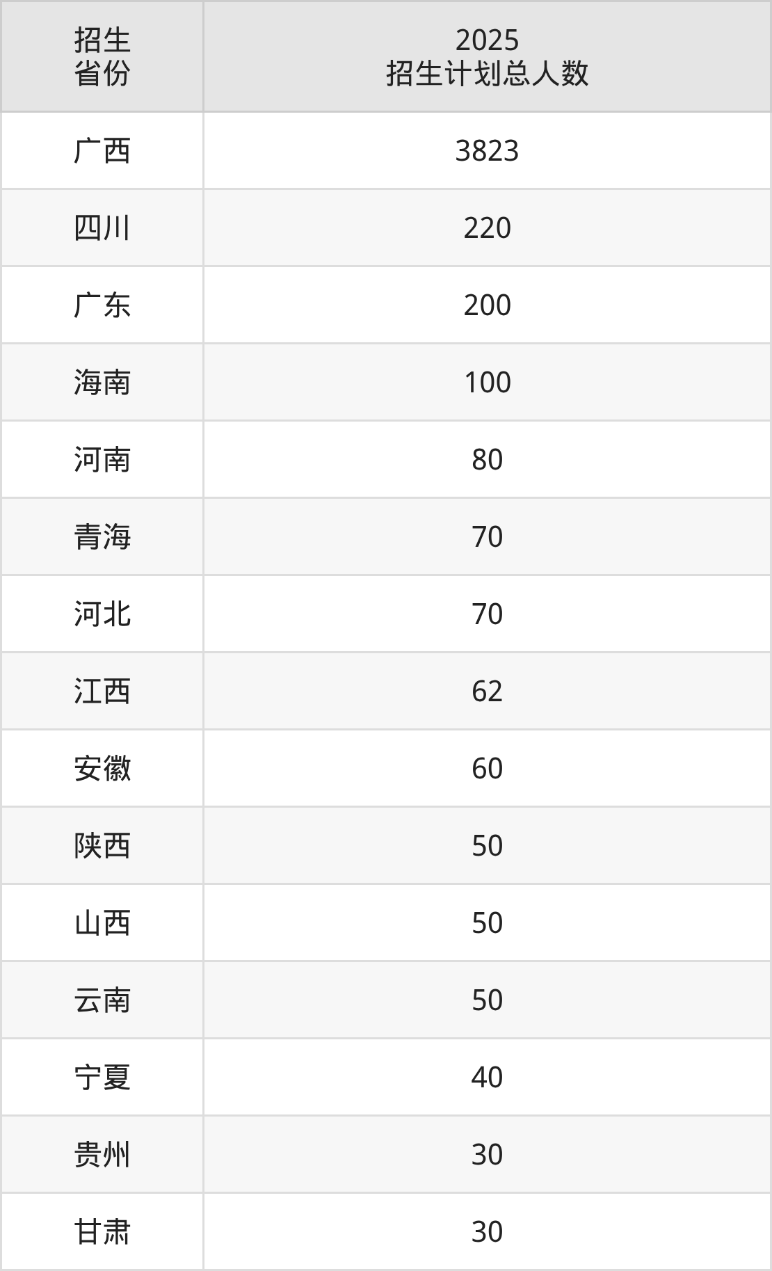 2025年广西城市职业大学面向全国15个省市开展本科招生;招生专业共25个,招生人数共4025人。2025年在广西壮族自治区招生计划总人数是3823人,其中,广西城市职业大学在广西壮族自治区招生人数最多的是中药学。广西城市职业大学在各省具体招生人数情况如下表。