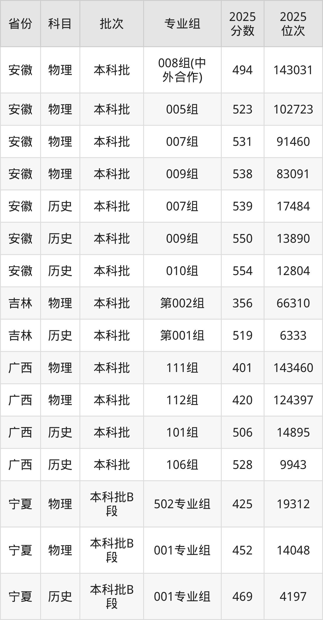 安庆师范大学008组(中外合作办学):2025年投档录取最低分为494分,录取最低位次为143031名。
