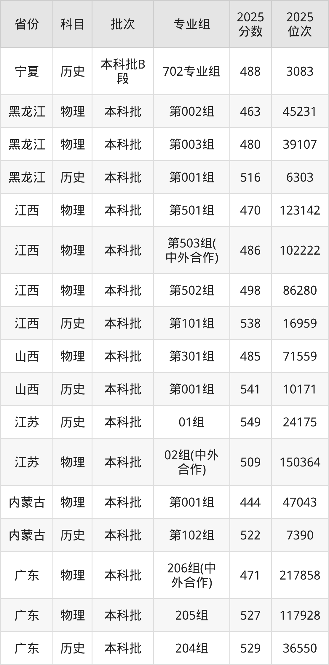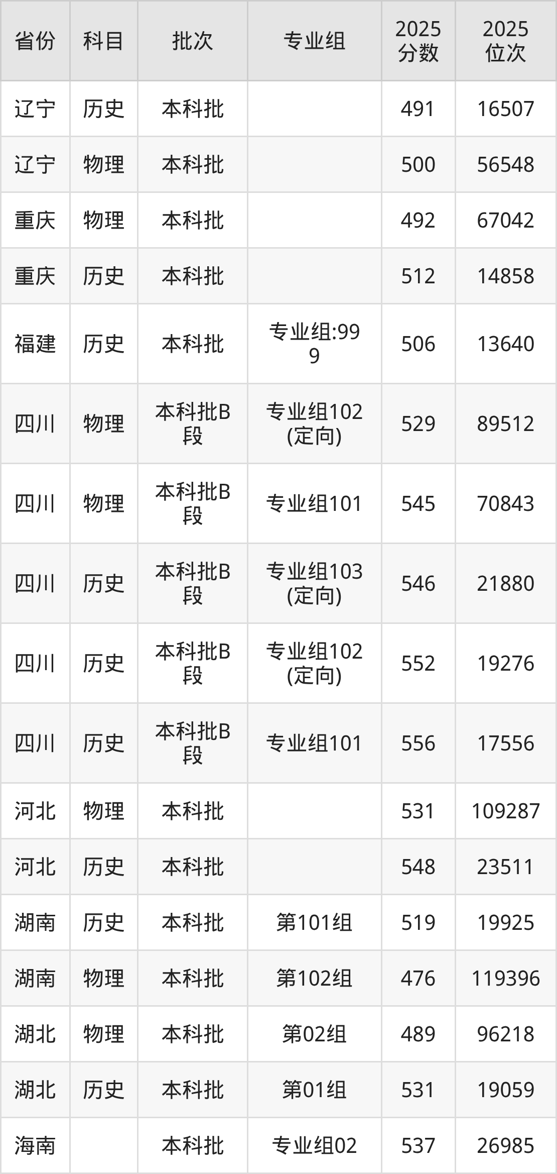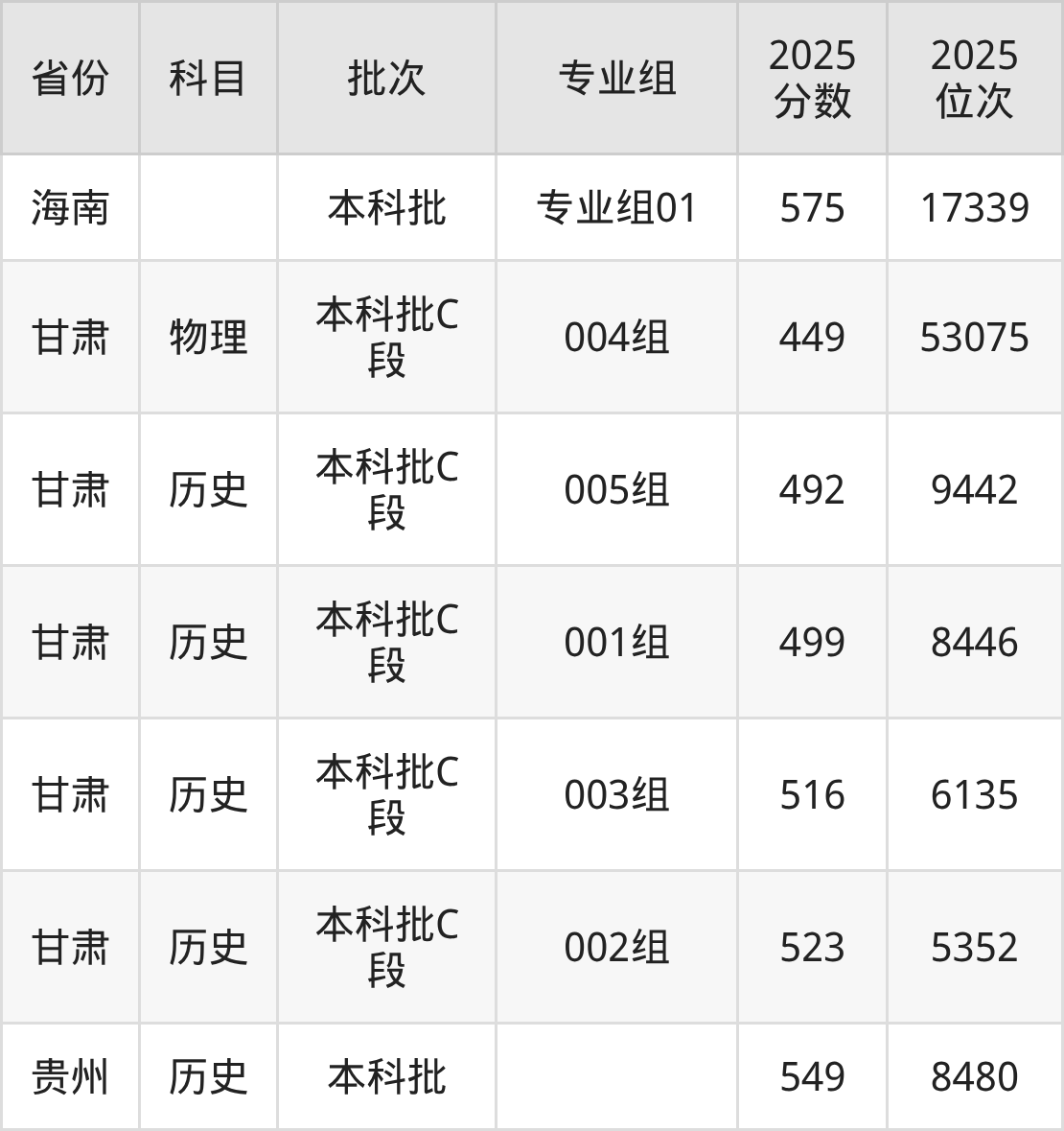 2025年在本科历史类进行招生,各专业组分数线详情如下: