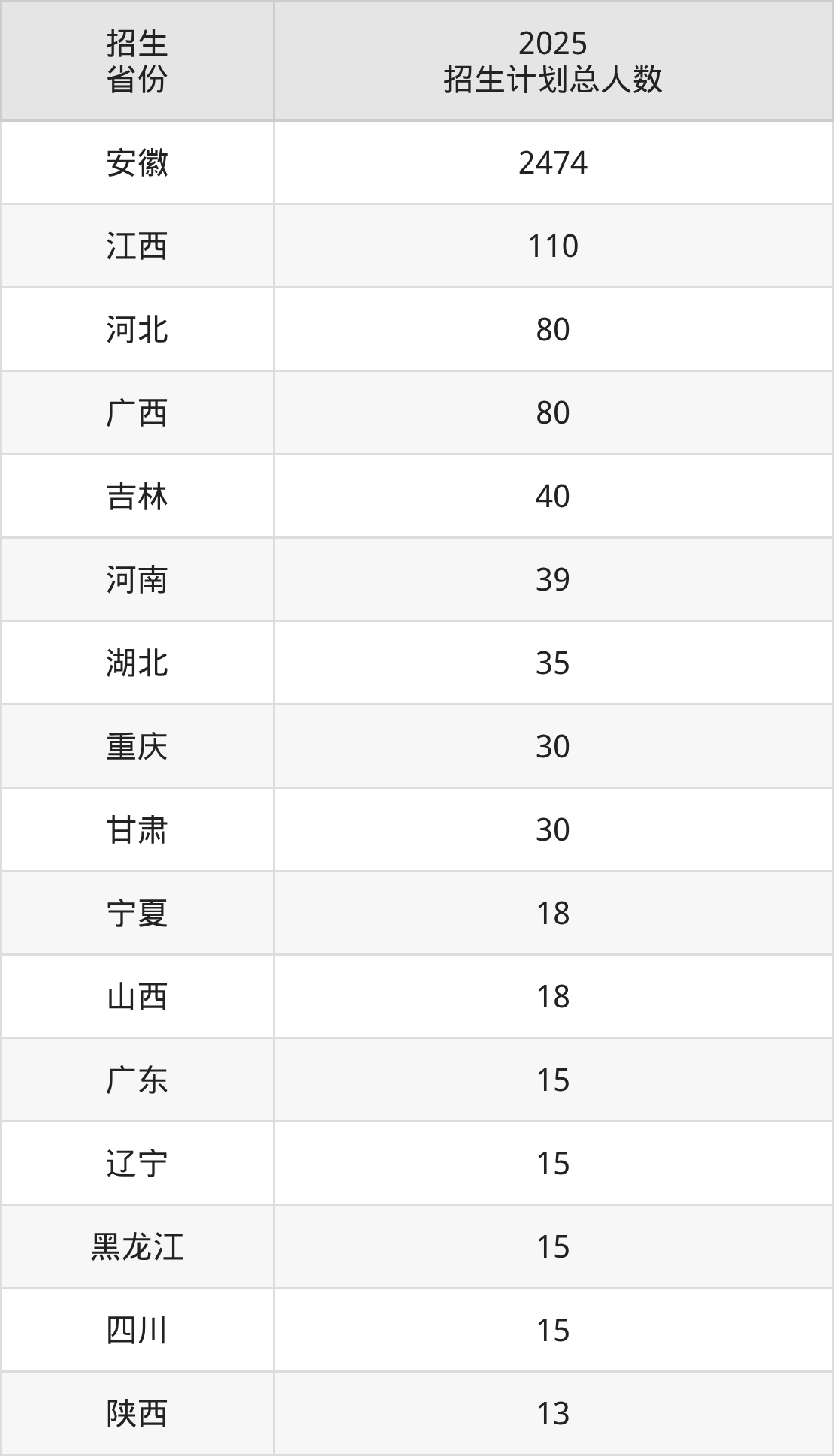 2025年安庆师范大学面向全国24个省市开展本科招生;招生专业共40个,招生人数共3097人。2025年在安徽省招生计划总人数是2474人,其中,安庆师范大学在安徽省招生人数最多的是计算机类。安庆师范大学在各省具体招生人数情况如下表。