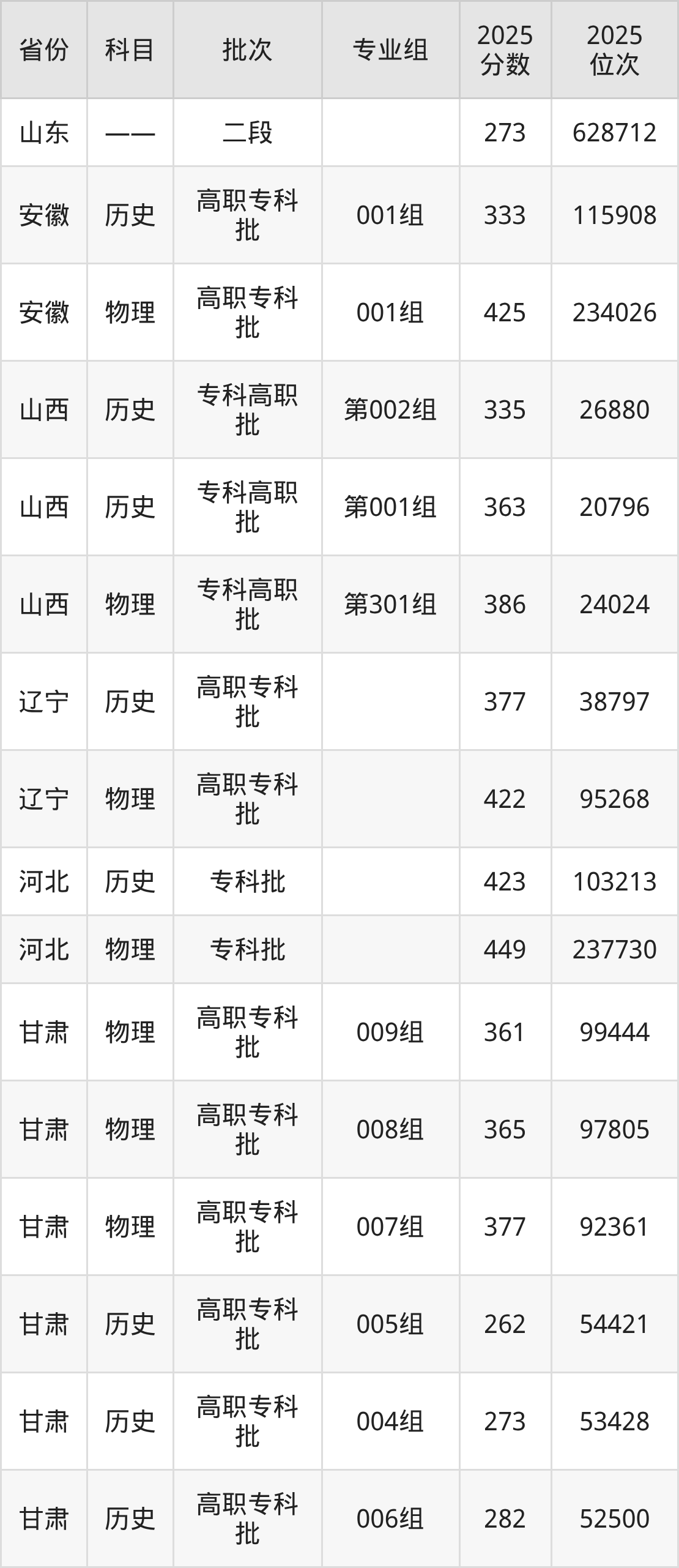 济南职业学院007专业组:2025年投档录取最低分为377分,录取最低位次为92361名。