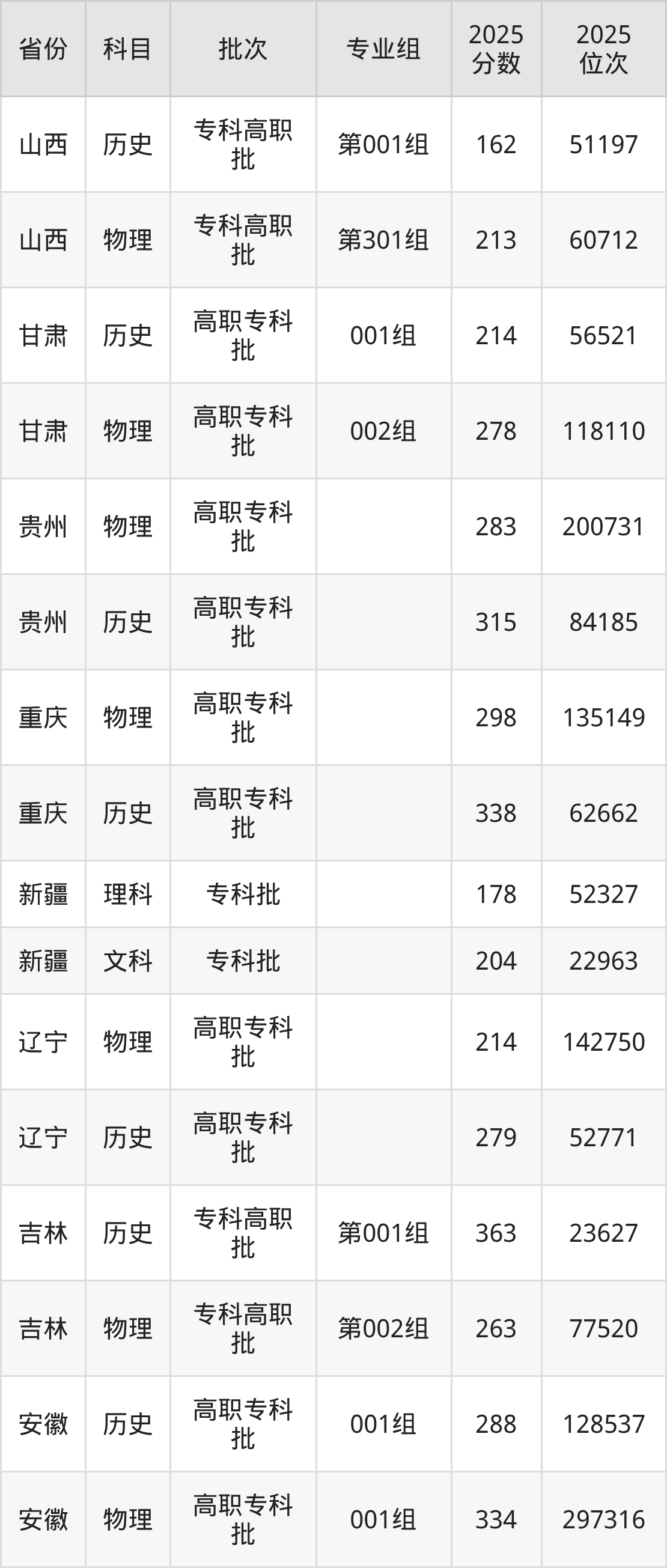 2025年抚顺师范高等专科学校全国录取分数线是150分到418分,录取最低在四川物理类(专业组101)、录取最高在江西历史类(第101组)。各省各专业组最低分具有差异,详情如下: